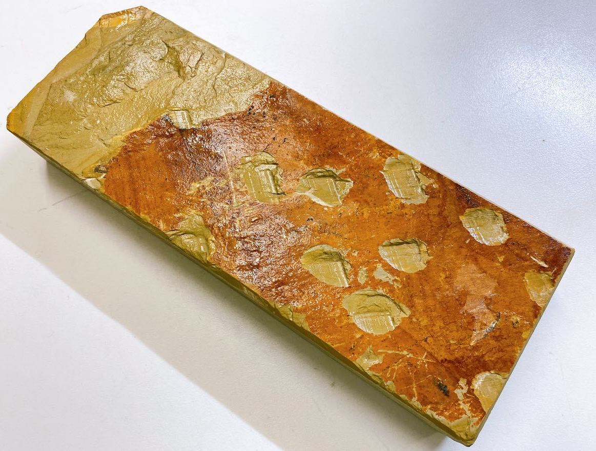Высококачественный бритвенный финишник, старого распила. Характерный, фирменный торцевой распил.При намокании поверхность камня приобретает красивый желто-зеленый оттенок. На сухую камень ближе к желто-серому.Рабочая сторона камня притерта и не имеет критичных включений и дефектов.После притирки поработал с несколькими бритвами , с использованием нагура разной зернистости, после чего рабочая сторона камня стала "зеркалить". И со временем камень начнет работать ещё тоньше.