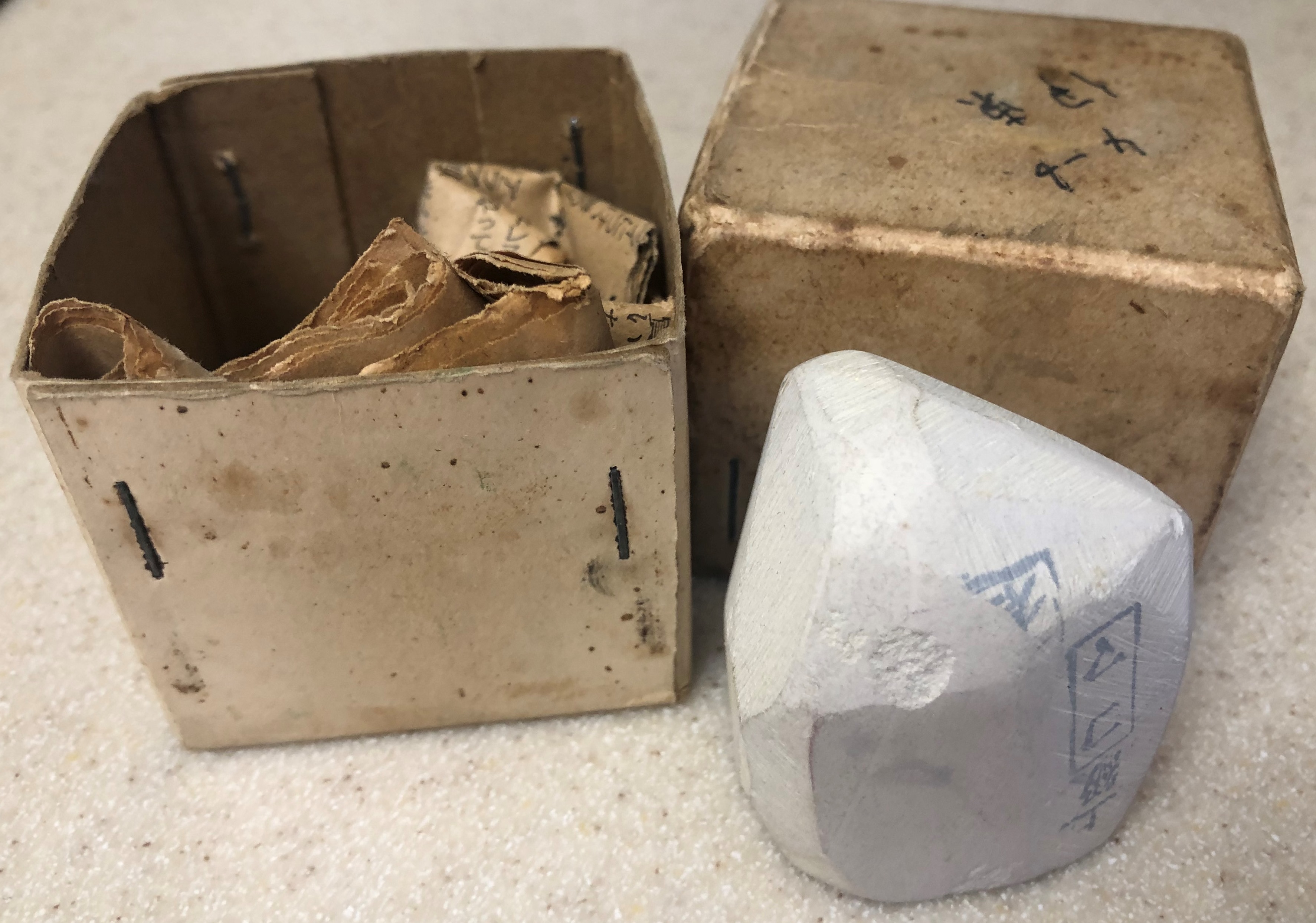 Предложу очень старенький японский бритвенный камушек, со парикмахерской. Хонияма киита. Что написано на обратной стороне коробки, не могу разобрать.