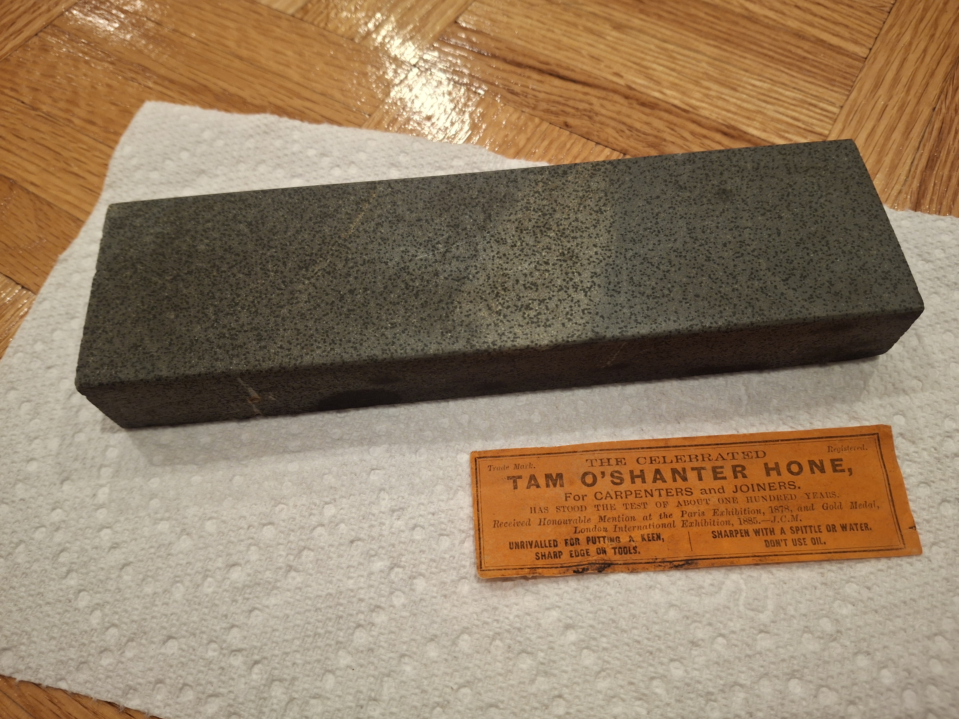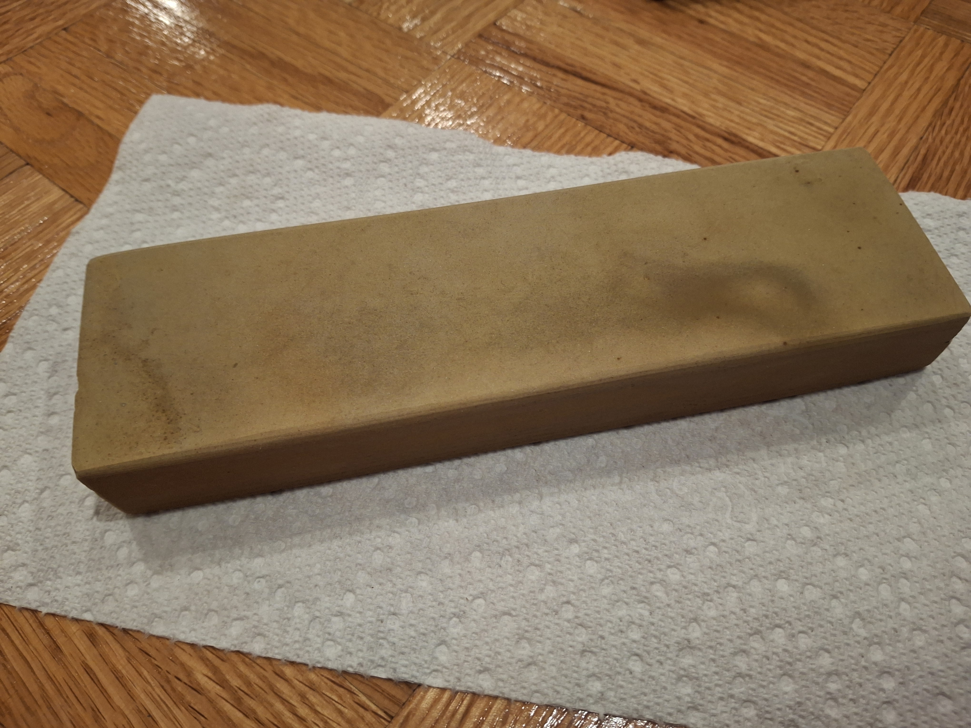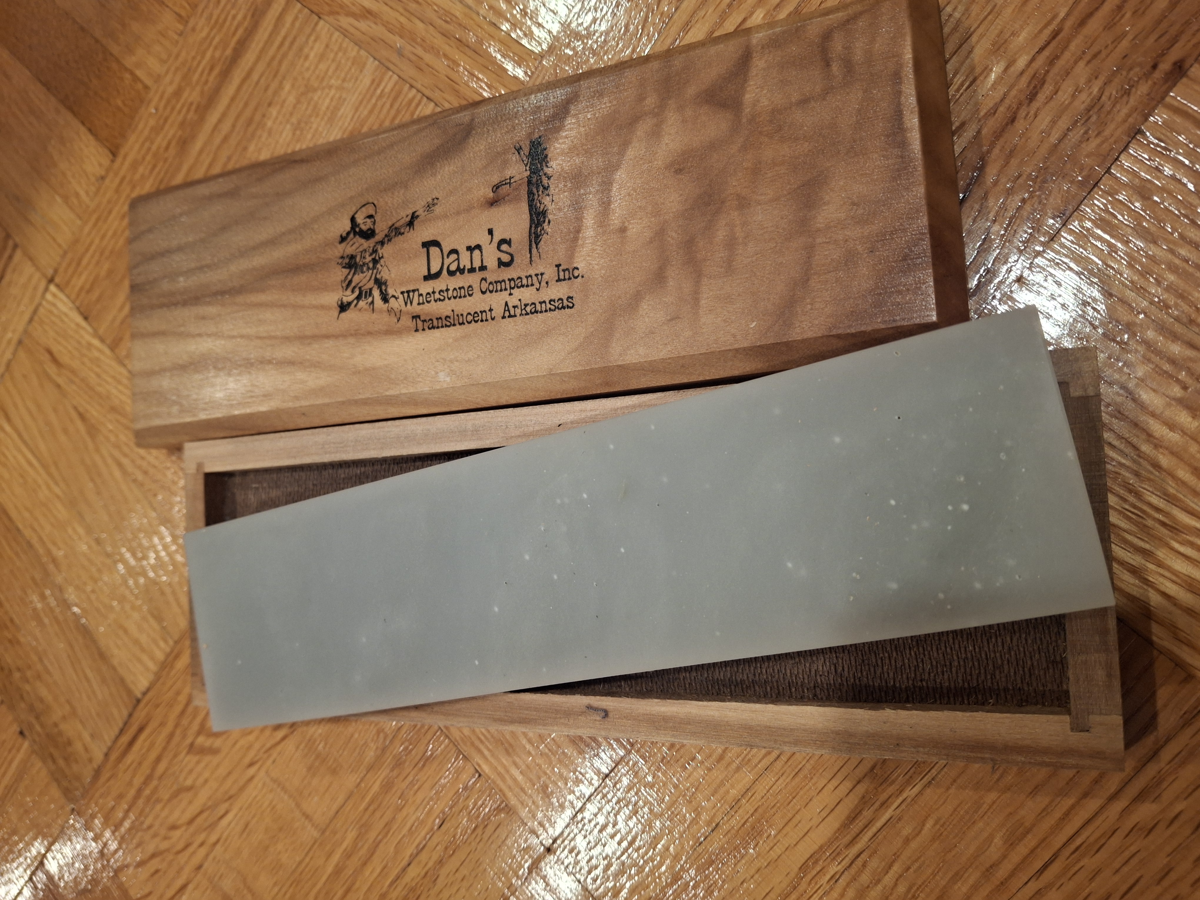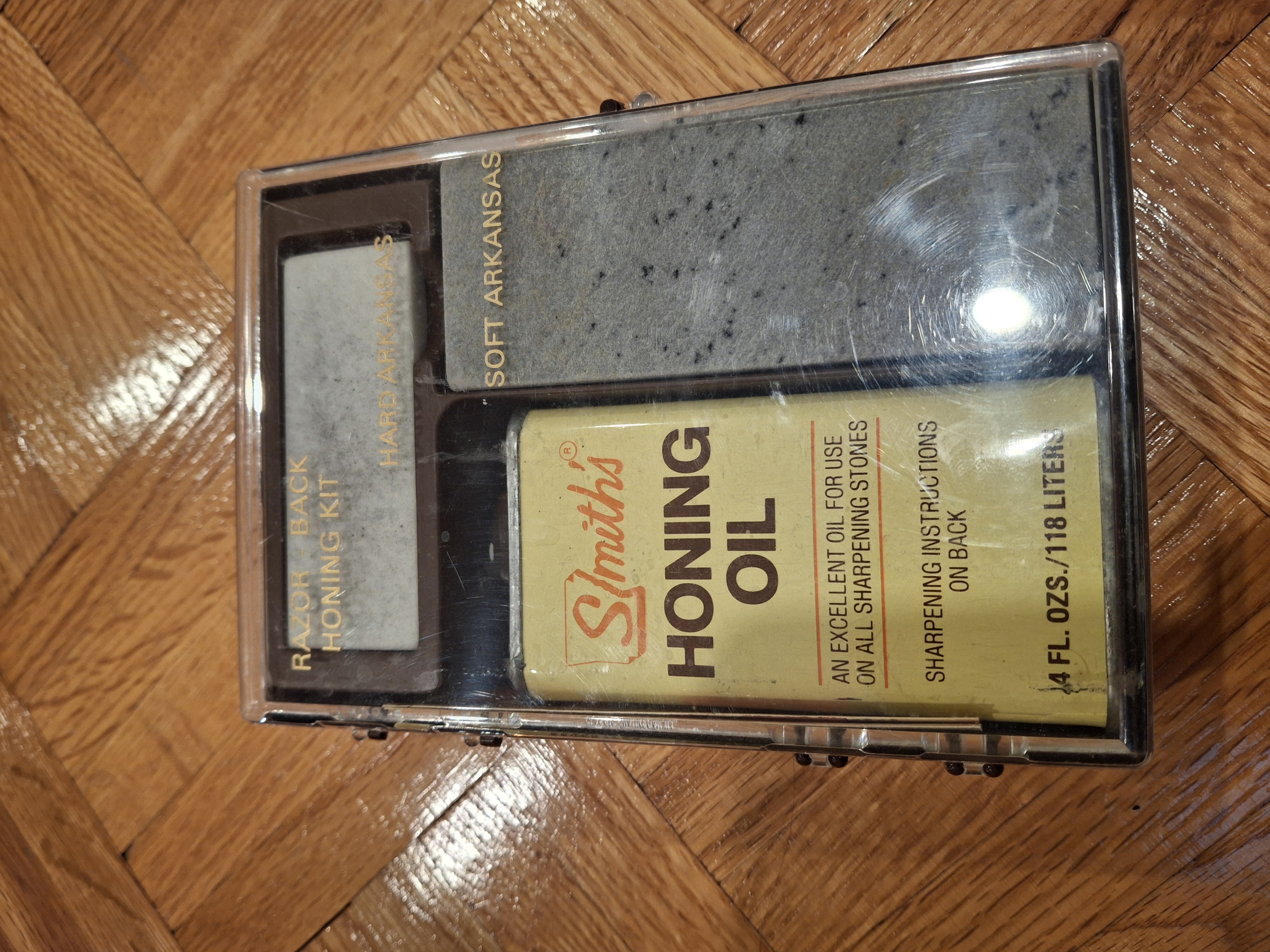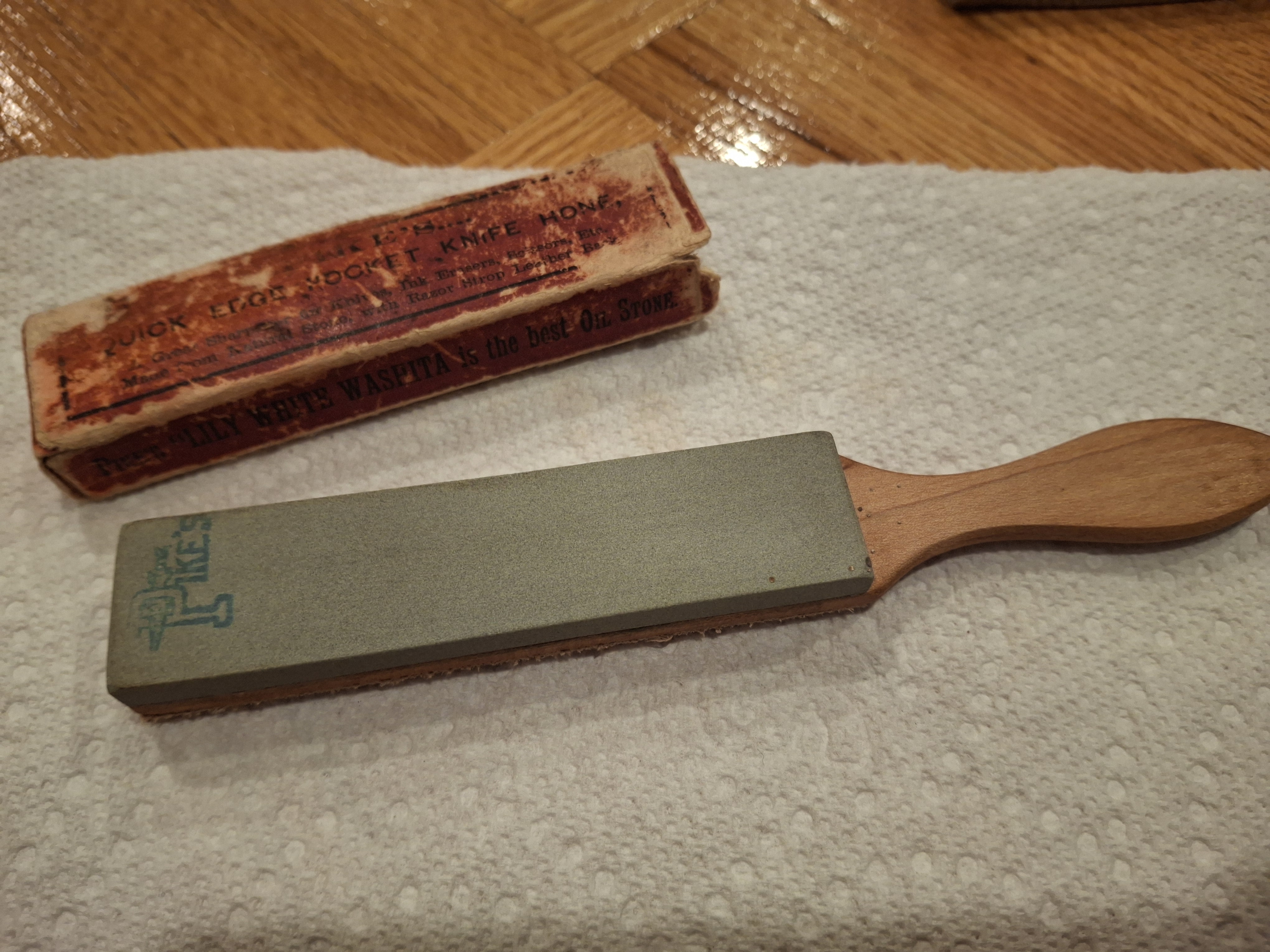 А это из последнего набега. Попорядку- там о шантер 8 дюймовый(не выдержал выколупал из короба в машине) был замаслен так, что понять что это было нереально. Второй- оказался карборундум, но очень тонкий. Третий, когда отмылся, оказался хиндостаном. Четвертый- вашита от смитов. Сейчас смиты такие камни называют хард Арканзас. Есть с чем сравнить. И последний, который в коробе ребром стоял- Лили вайт вашита с остатками родной этикетки.