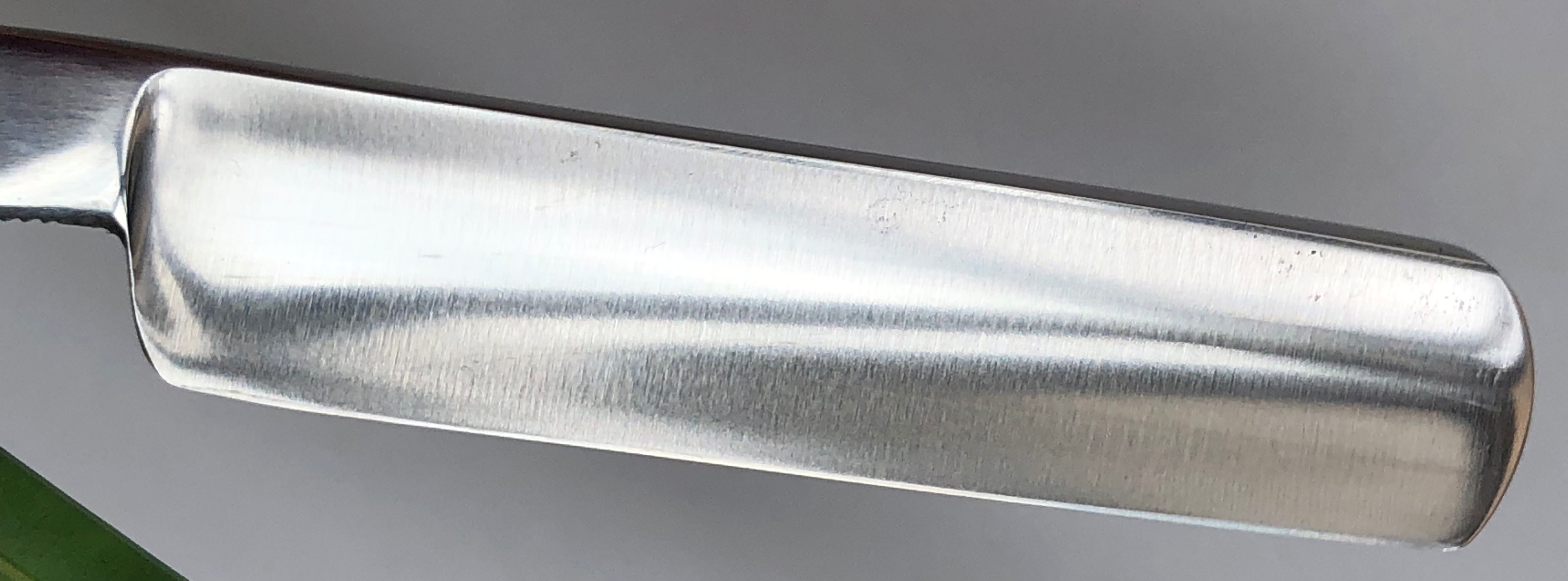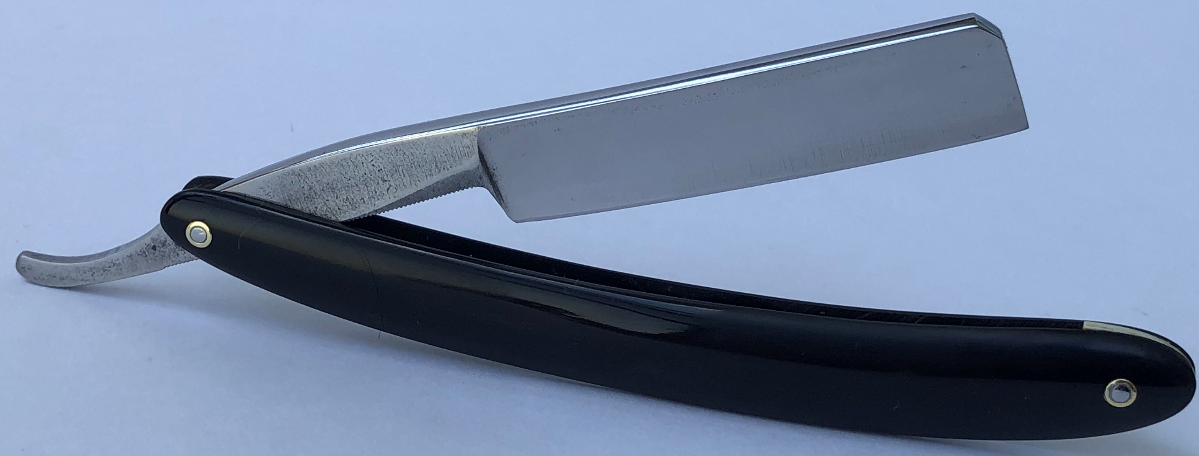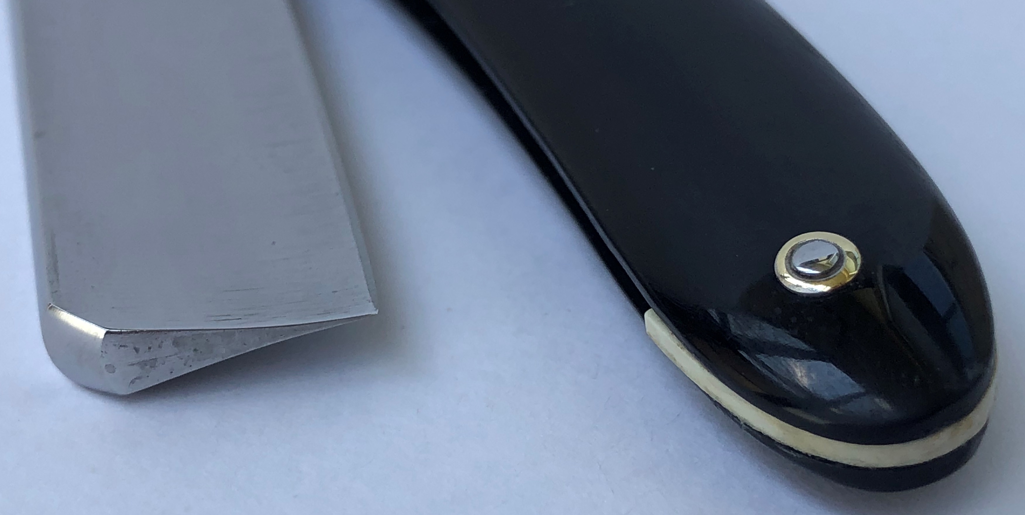 Само полотно на несколько мм укорочено.Было немного освежено от патины, с повторением "родного" характера шлифовки и умеренной полировки.Идеальная геометрия клинка. Сталь чистая, без видимых дефектов.Очень приятная во всех отношениях бритва, достаточно недорогая и если бы не укороченное полотно, то цены бы ей не было...