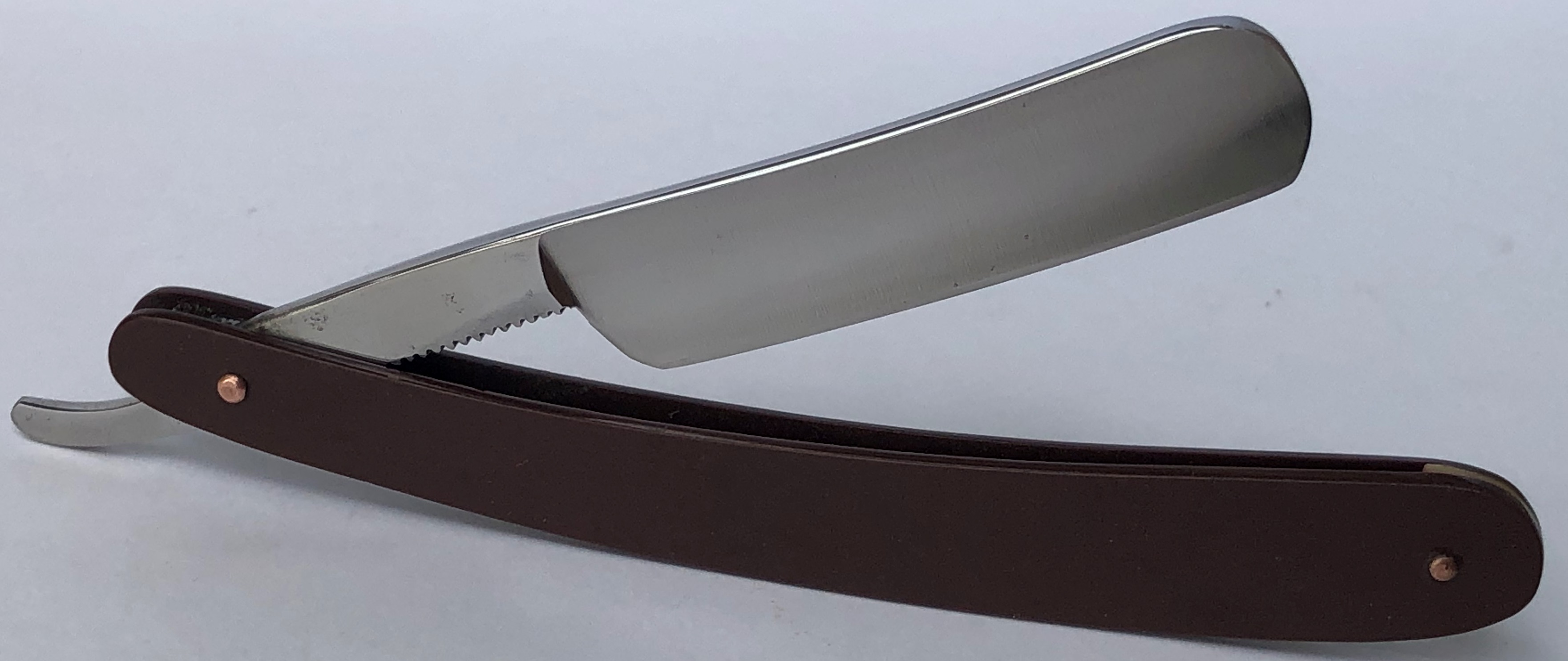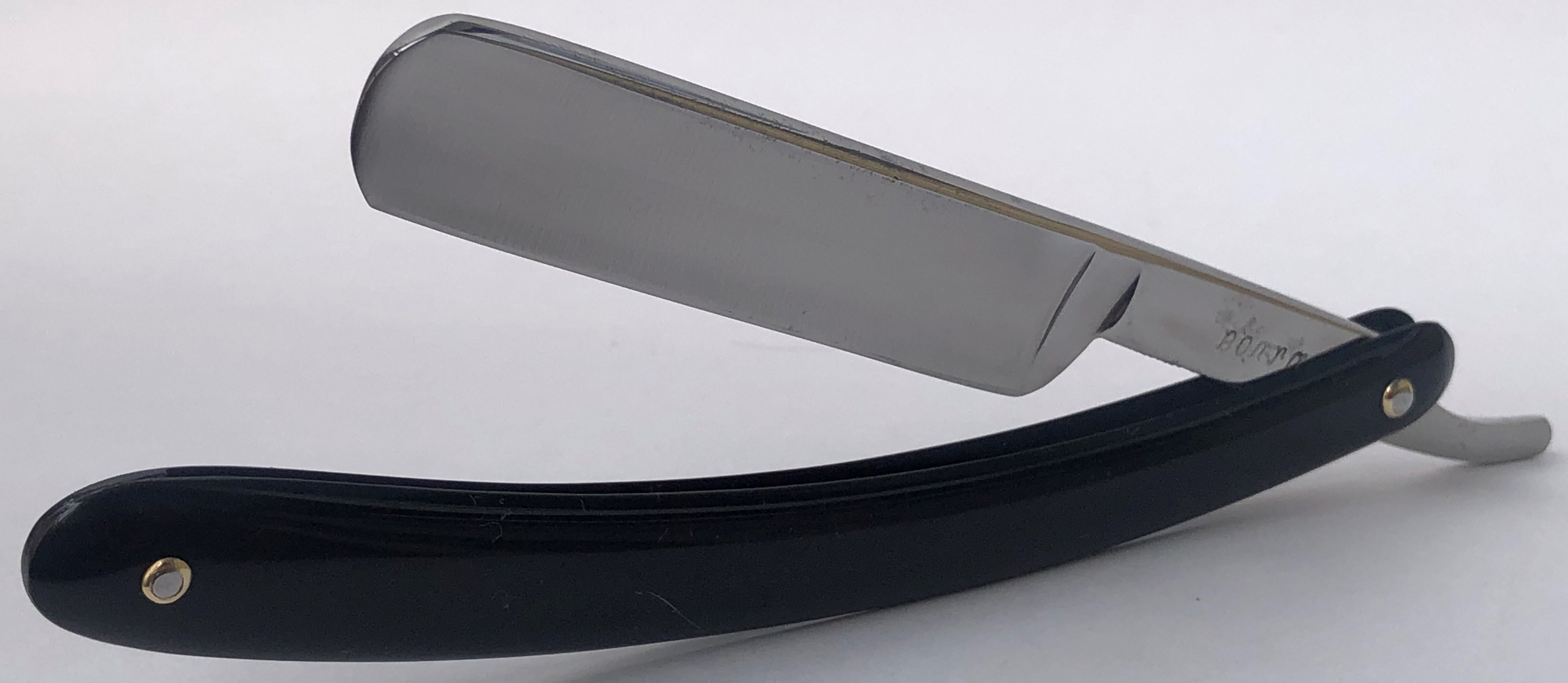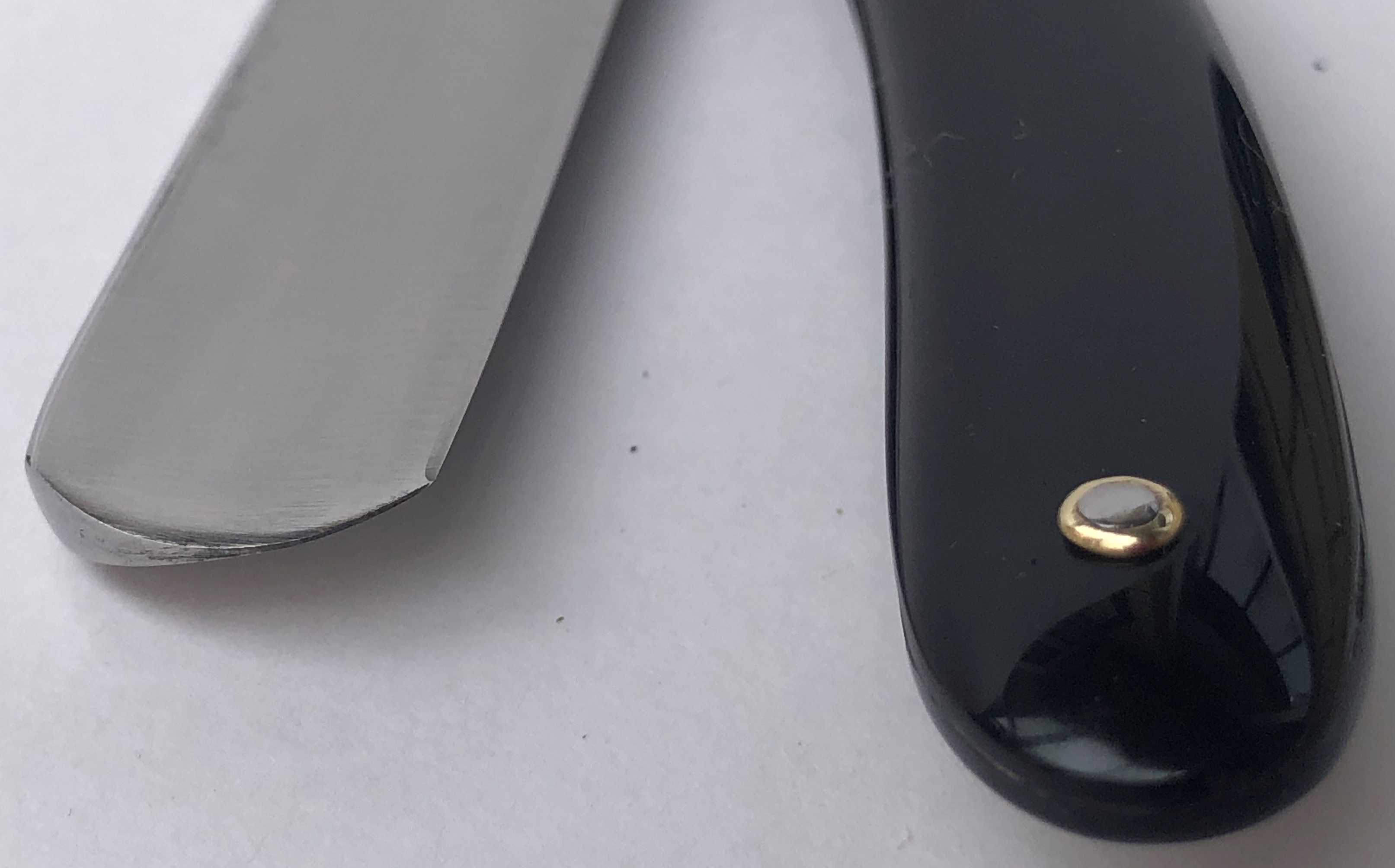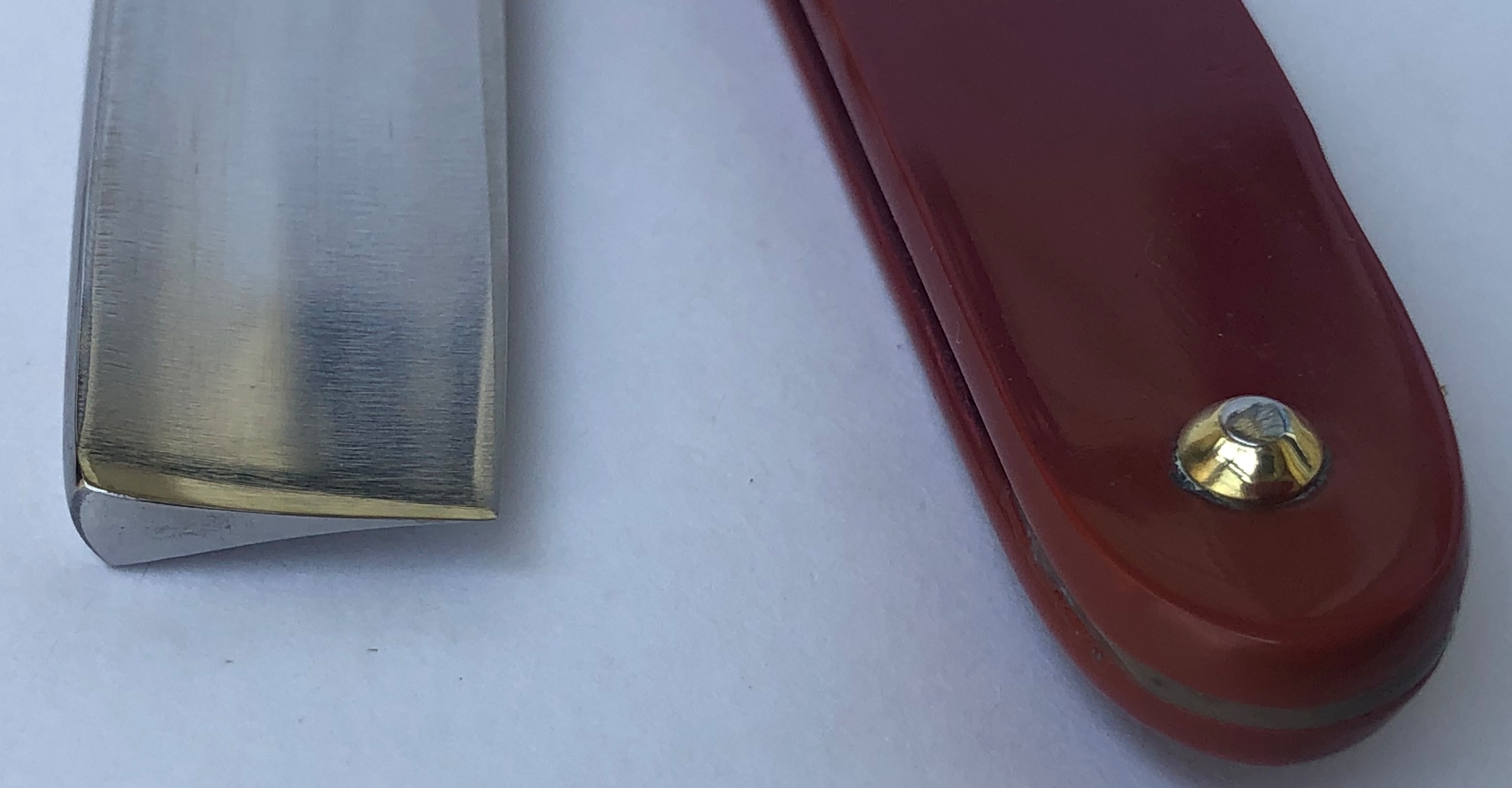 Само полотно на несколько мм укорочено.Было немного освежено от патины, с повторением "родного" характера шлифовки и умеренной полировки.Идеальная геометрия клинка. Сталь чистая, без видимых дефектов.Очень приятная во всех отношениях бритва, достаточно недорогая и если бы не укороченное полотно, то цены бы ей не было...