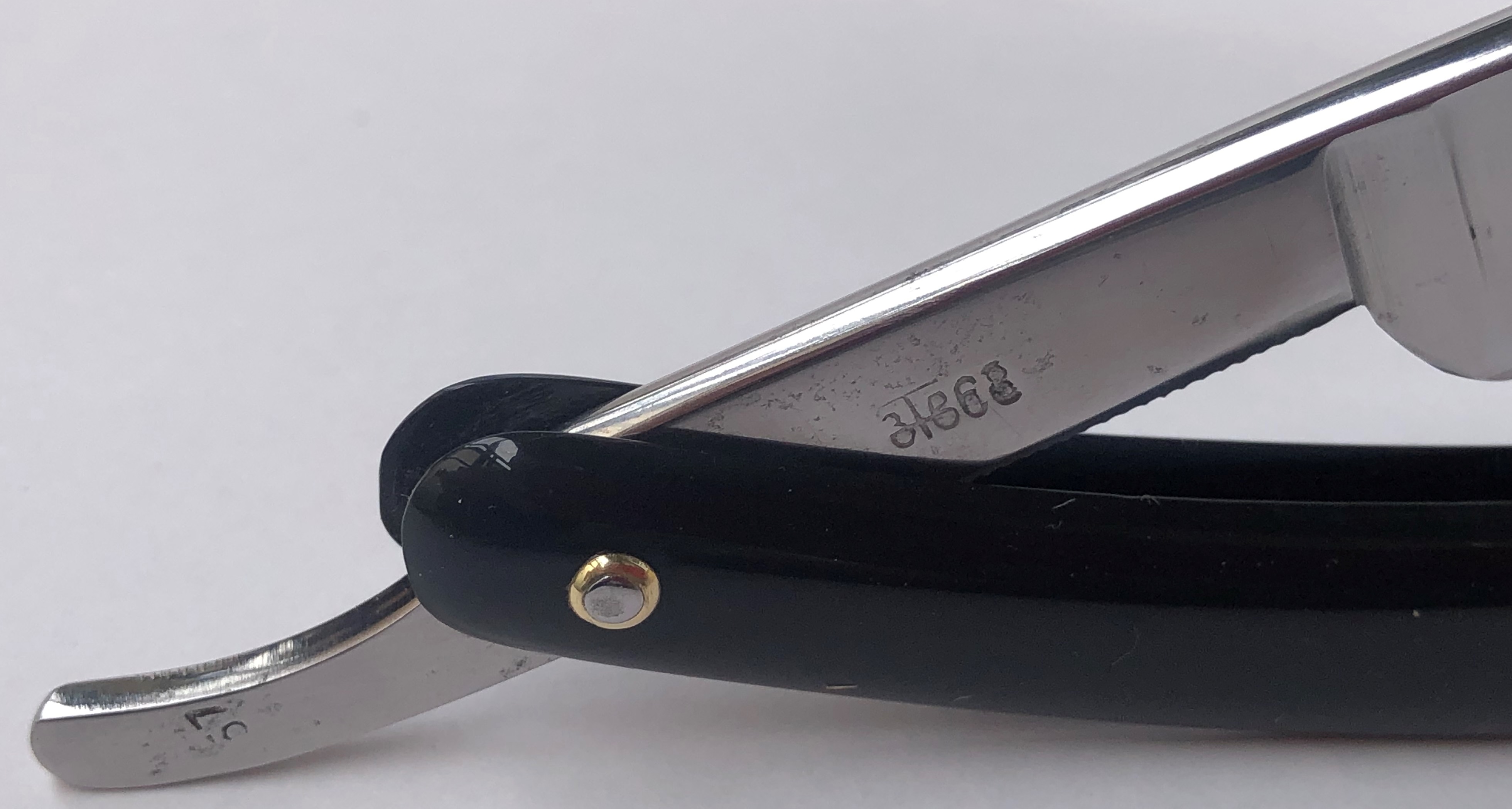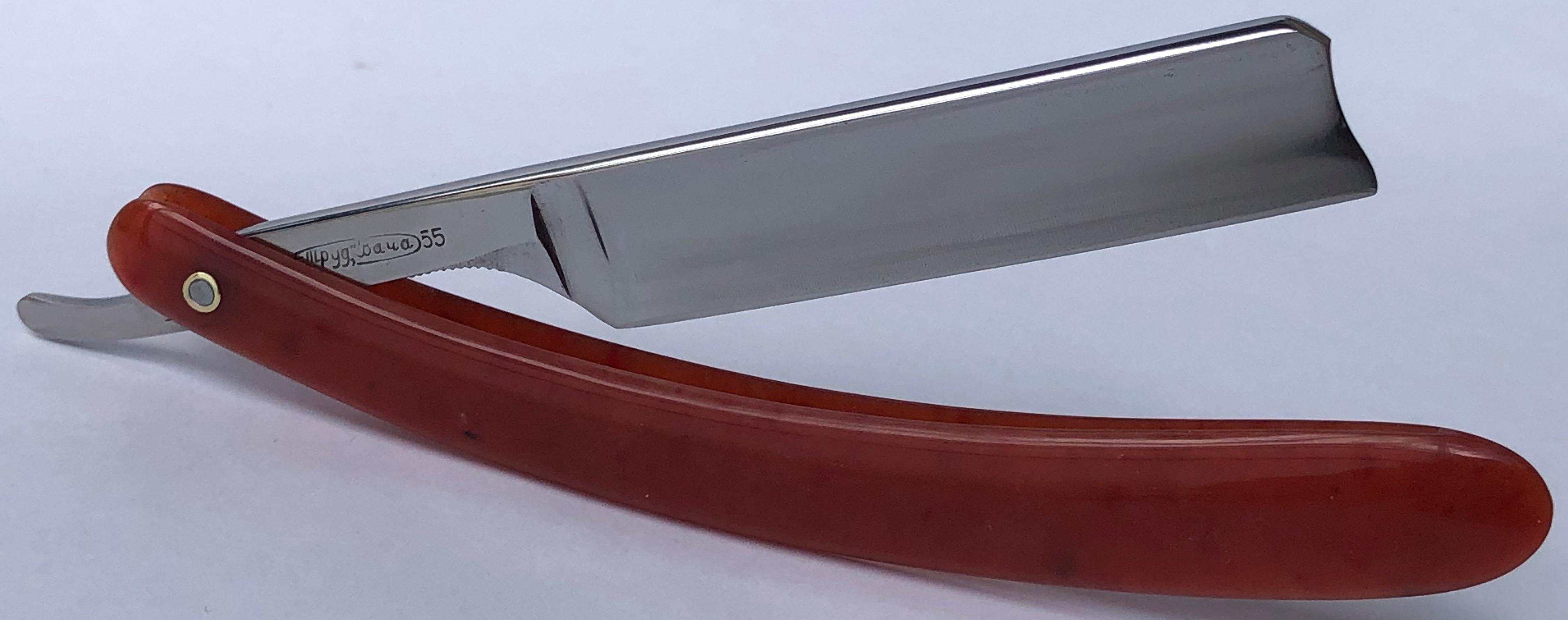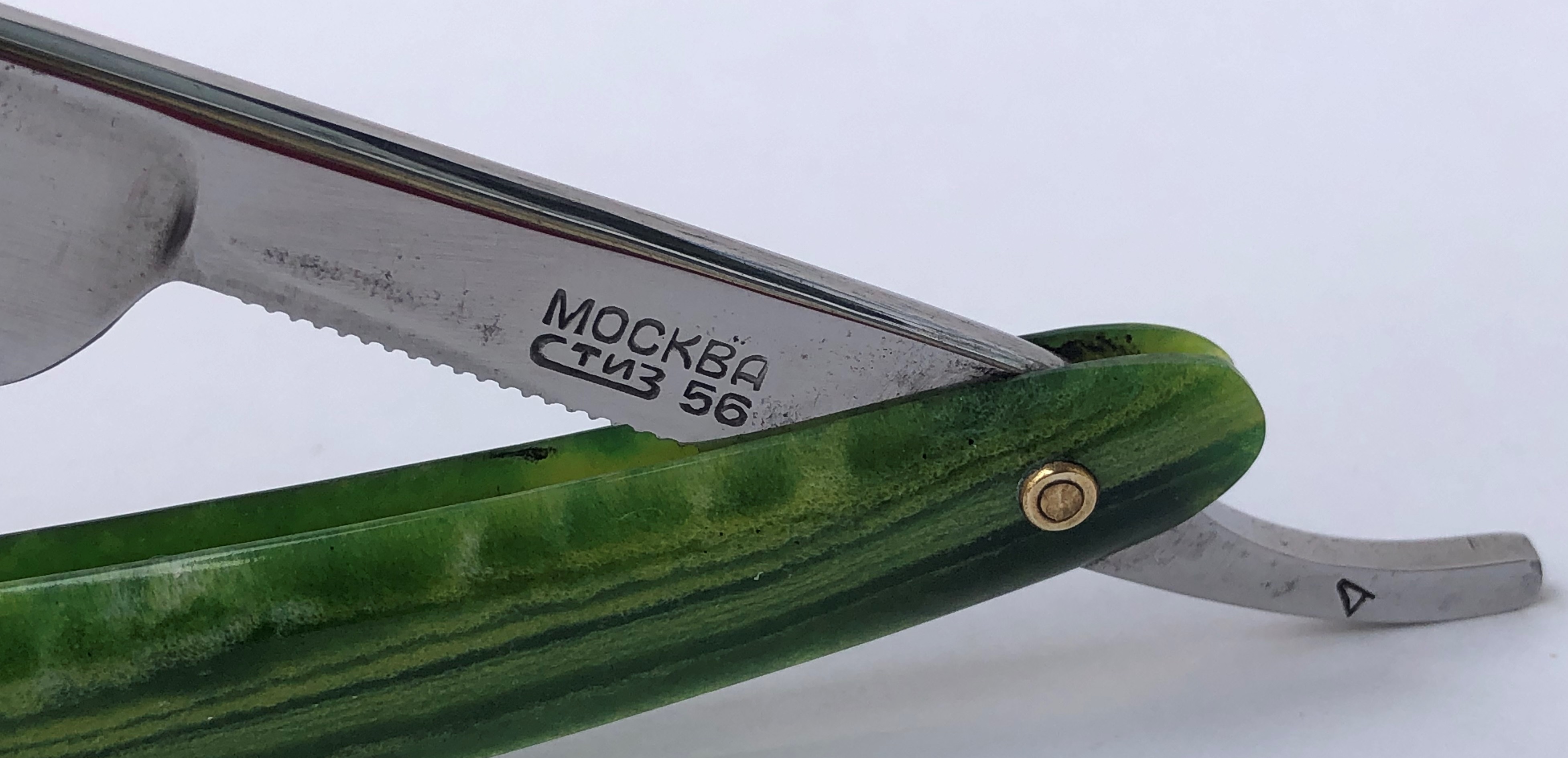 Кто бритву реставрировал и шлифовал полотно, мне не известно. По всей видимости бритва не разбиралась.Шлифовка аккуратная,кромочка ровненькая.Не стал ничего разбирать и чистить в районе осевого пина, но следы времени никоим образом не повлияют на процесс эксплуатации.