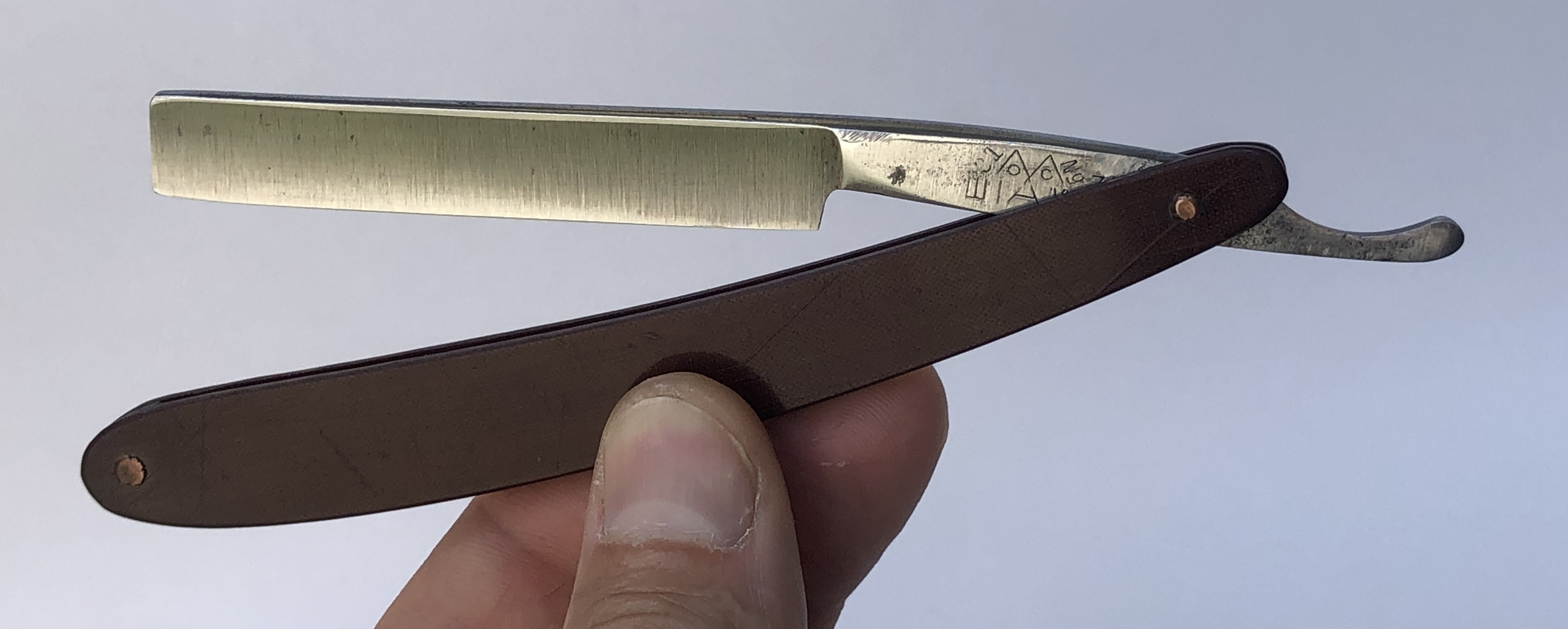 Почистил клинок от древней патины, заднюю часть клинка немного подправил от следов от заточных камней,лицевую сторону только косметически, чтобы сохранить гравировку.Кромочка равномерна по всей длине.Ручку намертво проклеил и залил эпоксидной смолой, отшлифовал и отполировал.Родные пины удалось установить заново.Неплохая, среднего размера , недорогая бритовка , будет удобна для новичка.Заточена и готова к бритью.