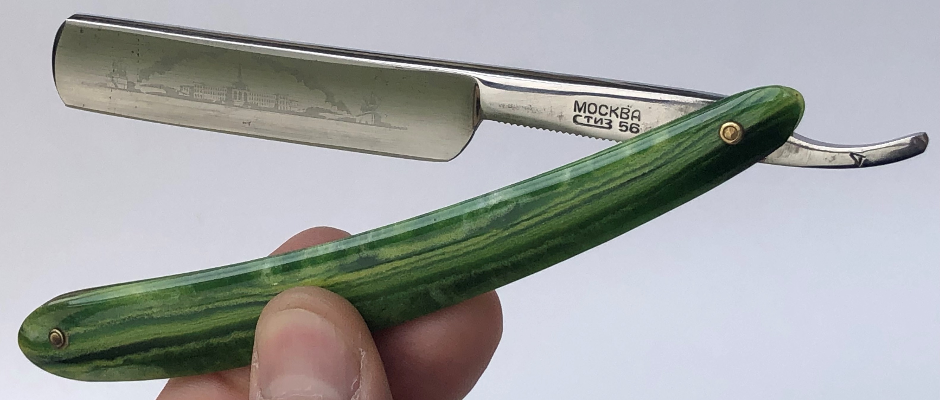 Бритва коллекционного состояния,изначально была с заводской заточкой. Была разобрана, для удаления окисления в районе осевого пина, собрана с добавлением внутренних шайб, а также с сохранением родных пинов.Сталь чистая, без видимых дефектов.Нанесение на полотне четкое, без потертостей.Заводская шлифовка и полировка.Идеальная геометрия клинка. Эффектная ручка цвета малахита. В тон ручки родная коробочка также 1958 года! Идеальный вариант для новичка и в коллекцию.