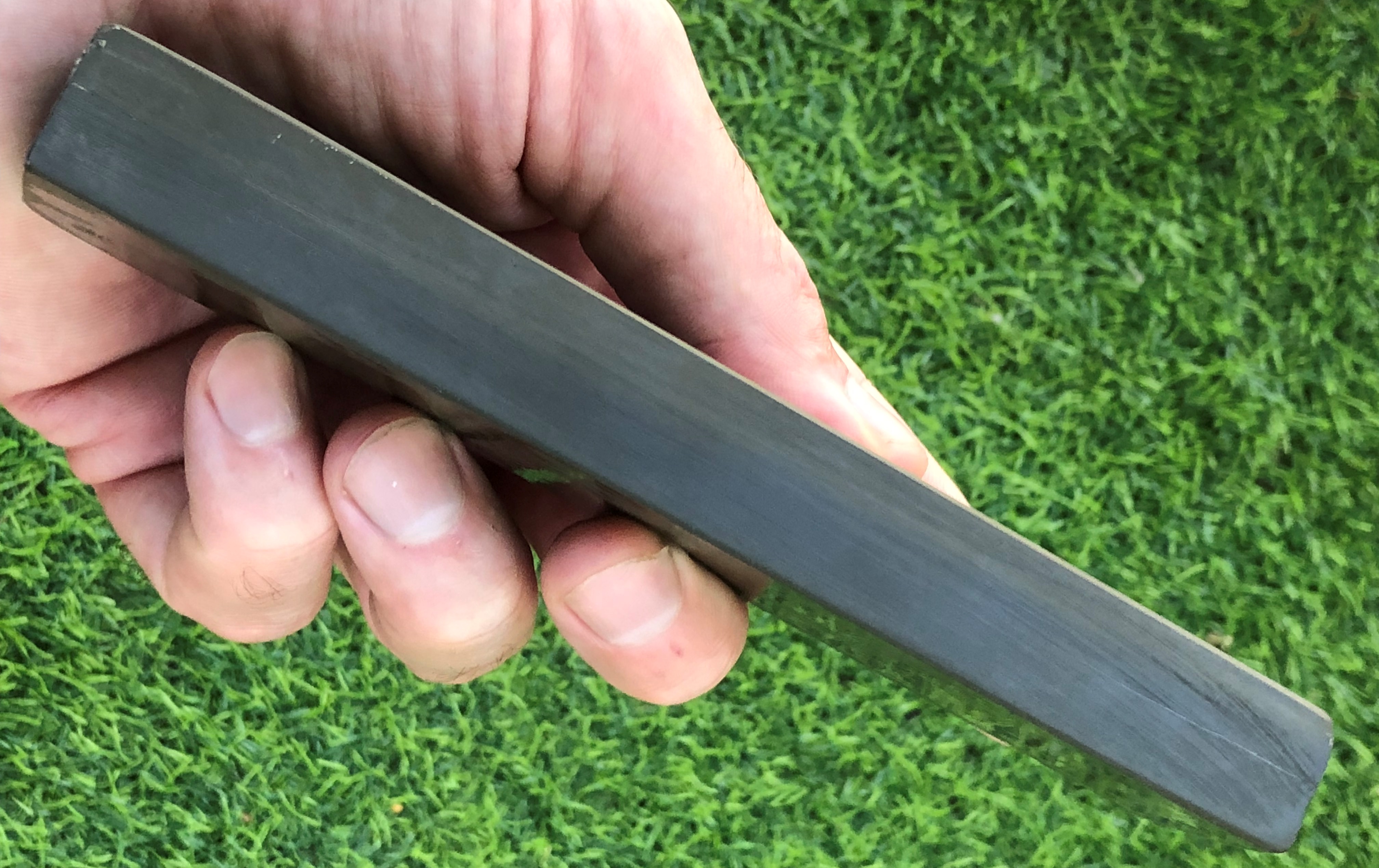 На торце осталась этикетка цвета:темно-синий. Стачала я подучал, что этикетка не родная, но если внимательно посмотреть, то камень представляет собой природно срощенные два слоя:темный оттенок переходит в самый качественный и быстрый(в плане работы) желто-зелёный цвет. Такие двух-слойные образцы можно увидеть на самых топовых и безумно дорогих камнях-barbers delight или "восторг парикмахера".Можно сказать, что за цену обычного 7-дюймового Эшера получаем редкий камень премиум класса.