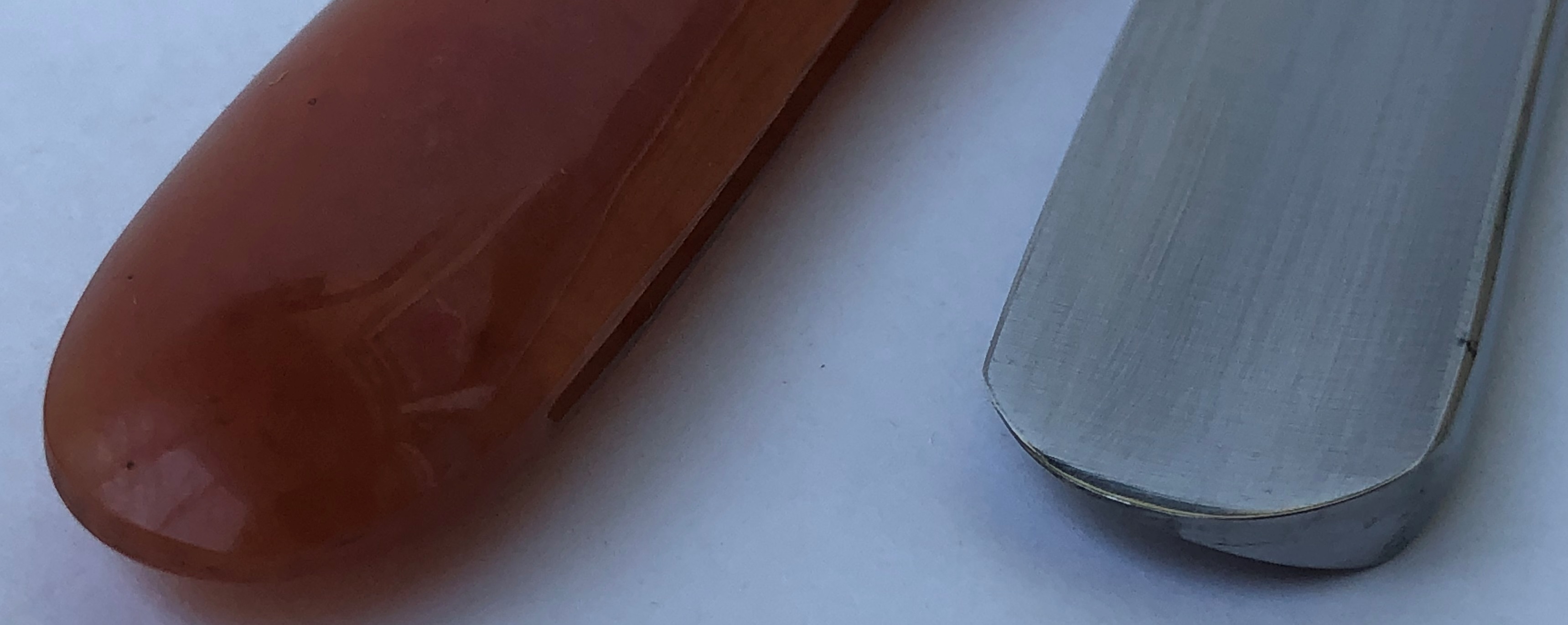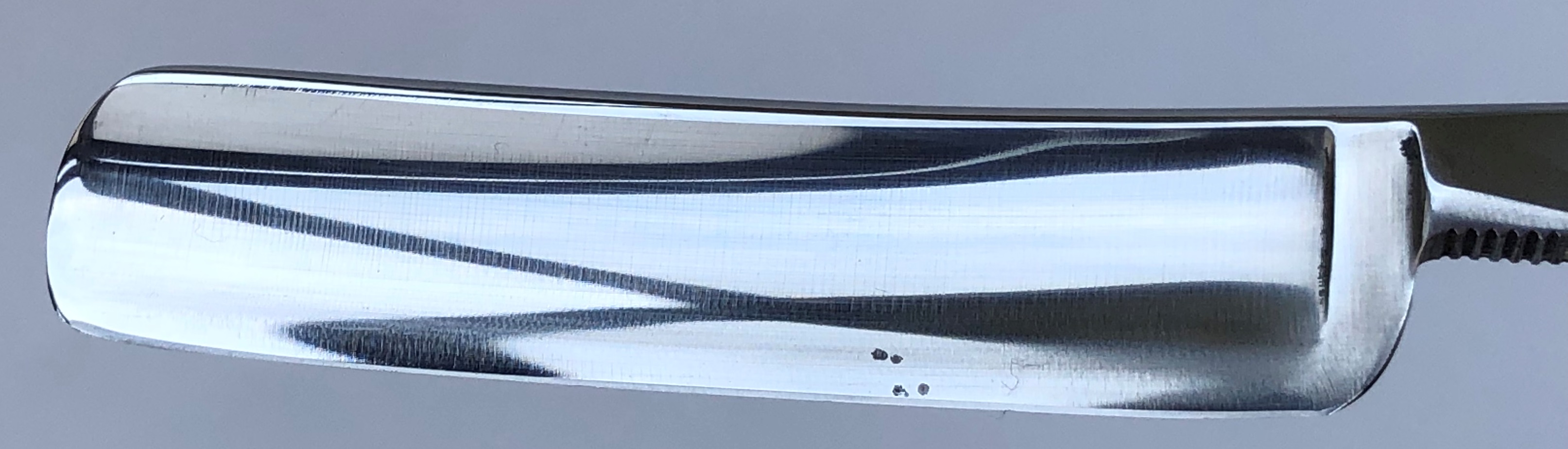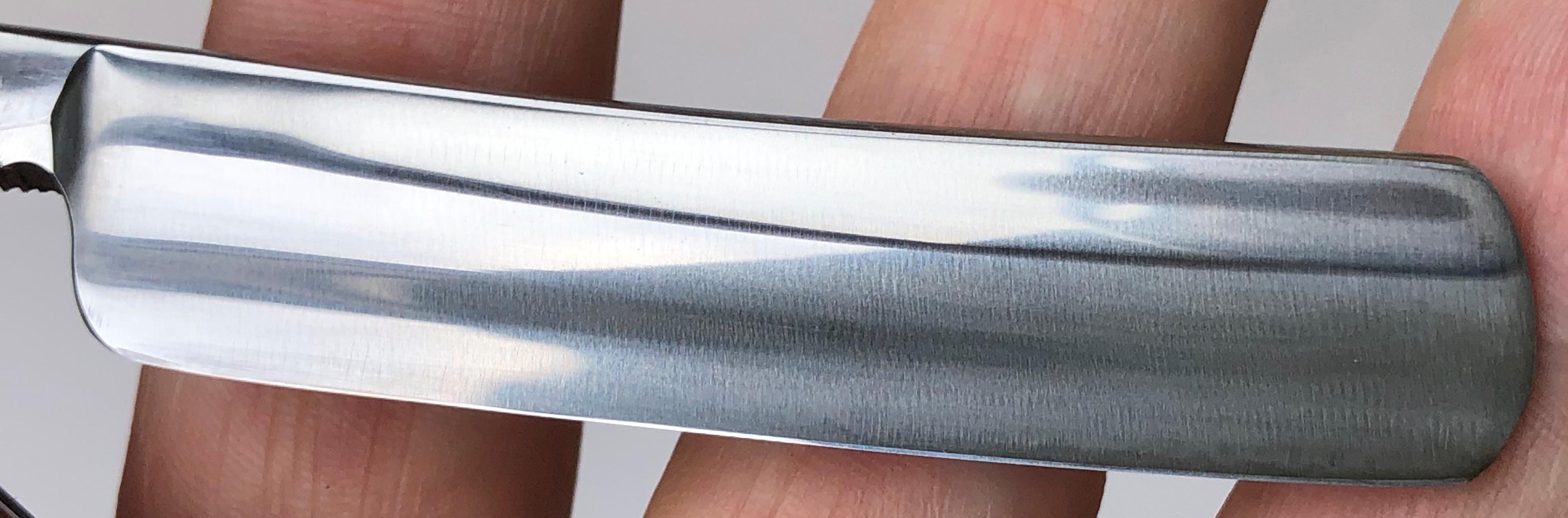 С большой долей вероятности могу сказать, что бритва именно советская и не рукодельная, а именно изготовлена на производстве.Забыл сделать фото оригинальных пинов, но те пины что стояли до косметических работ были именно как на Вачах и Стизах до и после военного периода. Т.е. медные расклепанные штифты, без шайб.По крайней мере я не помню, чтобы на импортных бритвах кто то и когда то ставил такие штифты, а не пины.Оправа напоминает Вачские и Стизовские бритвы 40-х годов, а сама форма клинка, с такой парикмахерской выемкой, очень похожа на стизовский "Спорт", а "горбатый" обушок на "Спартак".С другой стороны я специально сделал фото насечек на клинке, где они выполнены не так четко, как на заводских советских бритвах.За 10 лет мне попадалось несколько безымянных советских бритв, произведенных вот так качественно , а никак не кустарно.Сужу с точки зрения заточника, что качество стали ничем не отличается от качества советских бритв 40-х годов.Такая же плотная, тяжёлая и не сухая в заточке углеродка. Идеальная геометрия клинка:кромочка равномерна по всей длине.
