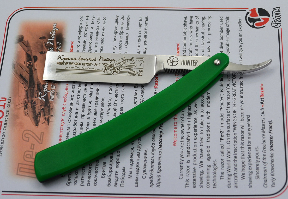 Продолжаем авиационную серию. Бритва: HUNTER Пе-2 Сталь: Uddeholm Arne(Швеция) Ширина - 6/8 Вогнутость - 1/4 Ручка - акрил(матовый) Ящик "Пе-2" - дуб