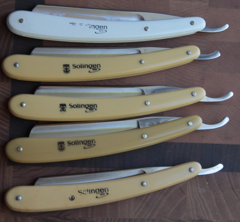 От немецкой фирмы SCHULZE. Ширина полотна-18 мм. Все 7 бритв находятся в очень хорошем состоянии. Тремя бритвами пользовались постоянно, а на остальных четырёх следов пользования не заметил. Бритвы все целые: полотна, оправы. Не разбирались и не ремонтировались. Всё в оригинале. Кожаная коробочка немного разошлась по шву от старости, но спокойно исправляется. Ржавчины нет, за исключением налёта патины. Бритвы продаются целиком, как есть-не точенные и не чищенные. Оставляю возможность повозиться с ними новому хозяину. Вложить душу, так сказать, в свою работу. Самому времени нет этим делом заниматься. Достаточно редкая вещь по нашим временам. Не пропустите. Цена за весь комплект 23000 руб с доставкой.ПРОДАН Spoiler Show Ещё фотки Spoiler Show