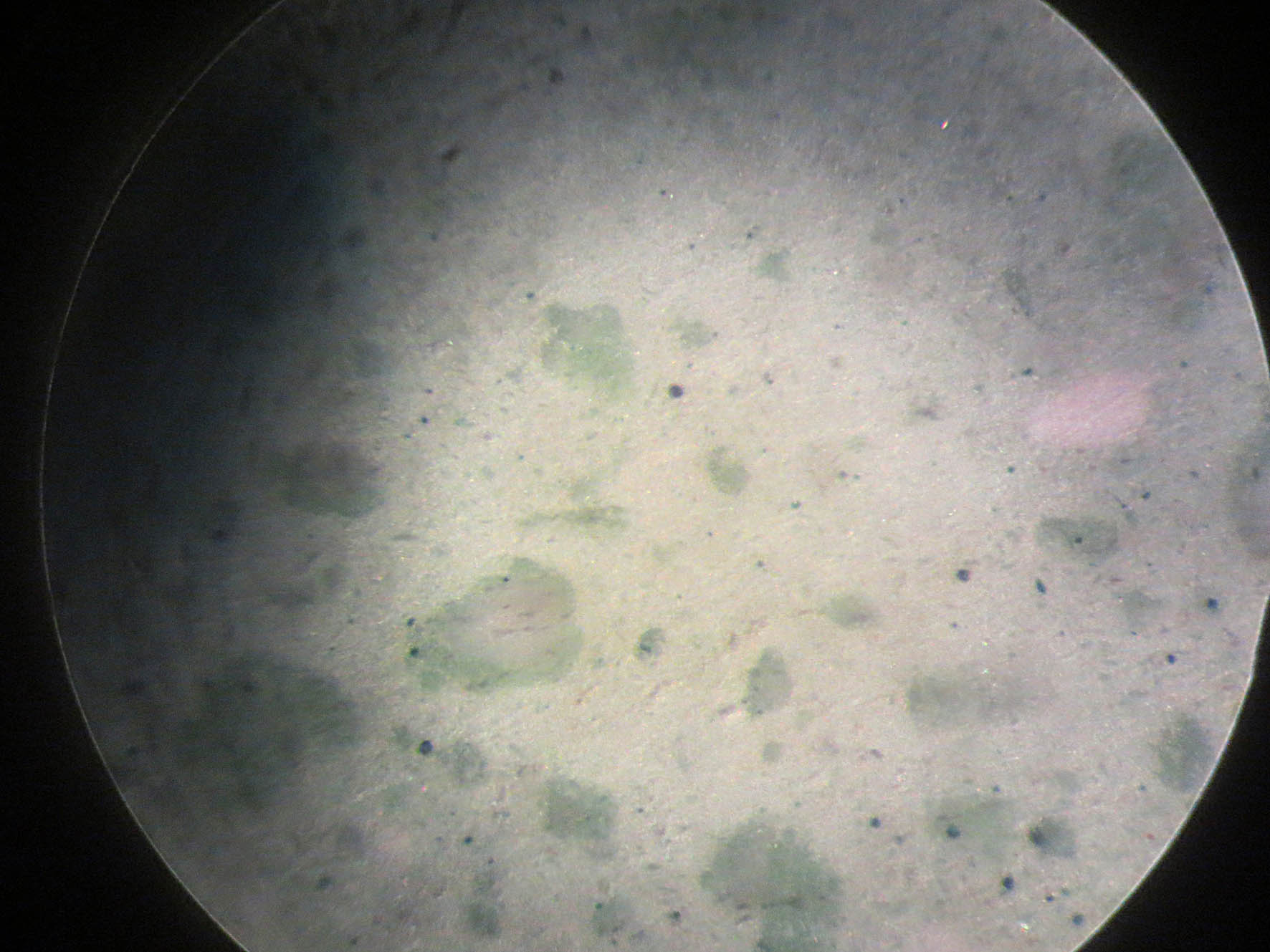 Мне тоже немного непонятно - на втором фото видно, что пятна на бруске явно от миллиметра до трёх скажем, но на снимке при увеличении в 80 раз при поле зрения 1,25 мм, они явно намного меньше. Это какой-то компьютерный микроскоп или оптика..? Можешь сделать просто фото окрашенного участка бруска на меньшем увеличении, может на снимке просто часть пятна окраски?