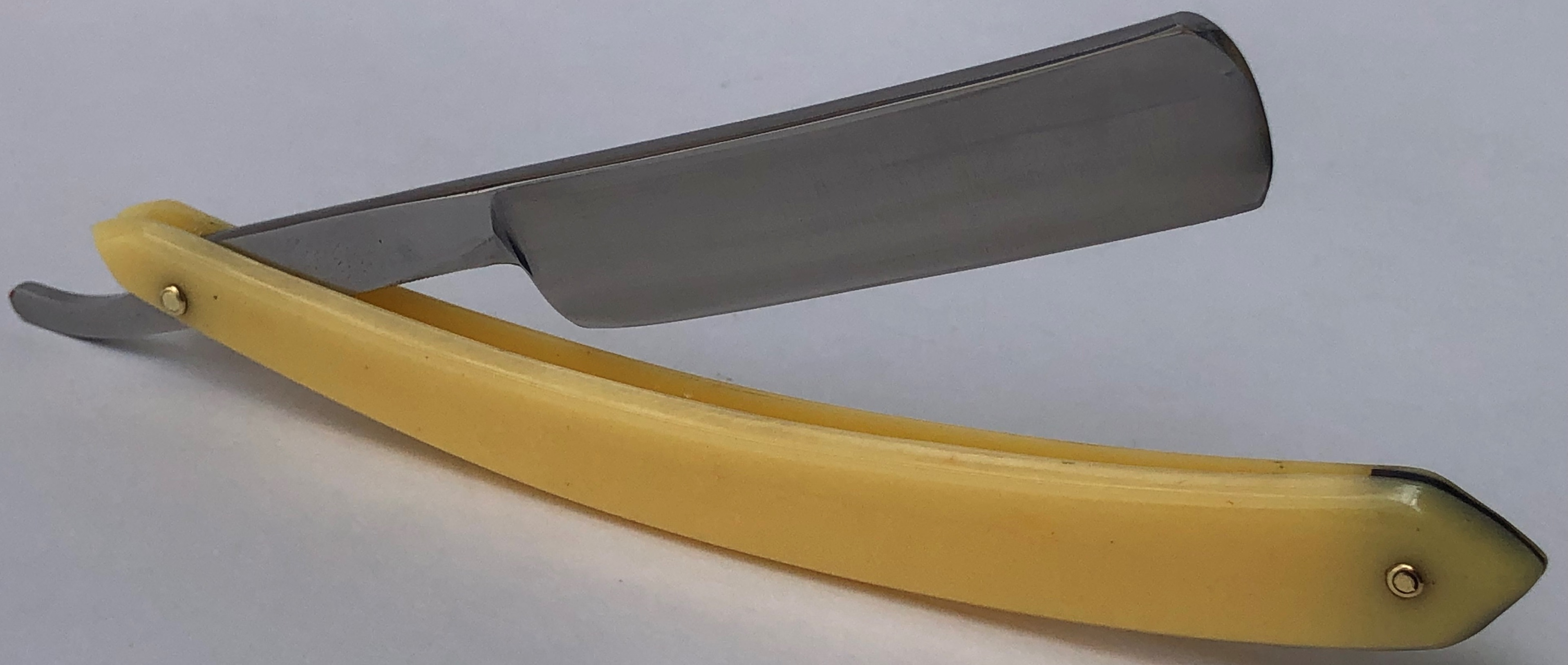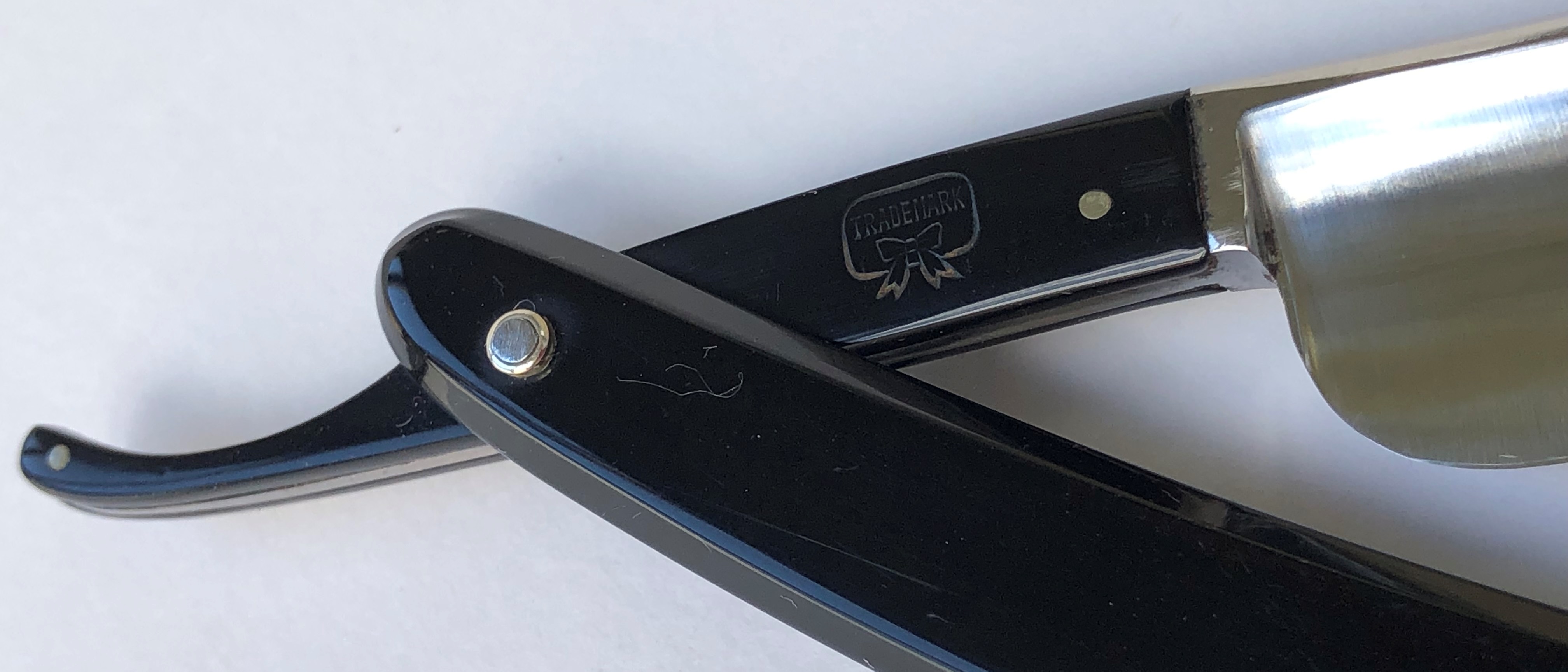 Клинок привел в порядок, убрал небольшую утОчку обушка, перешлифовал и умеренно отполировал."Cледы времени" в районе осевого пина оставил, для придания старинному клинку естественного вида.Родную ручку заменил на другую, пластиковую.Внутренние шайбы и новые втулки поставил.Кромочка ровненькая по всей длине.Парикмахерская метка. На мой взгляд, очень неплохая и недорогая бритва из прошлого.
