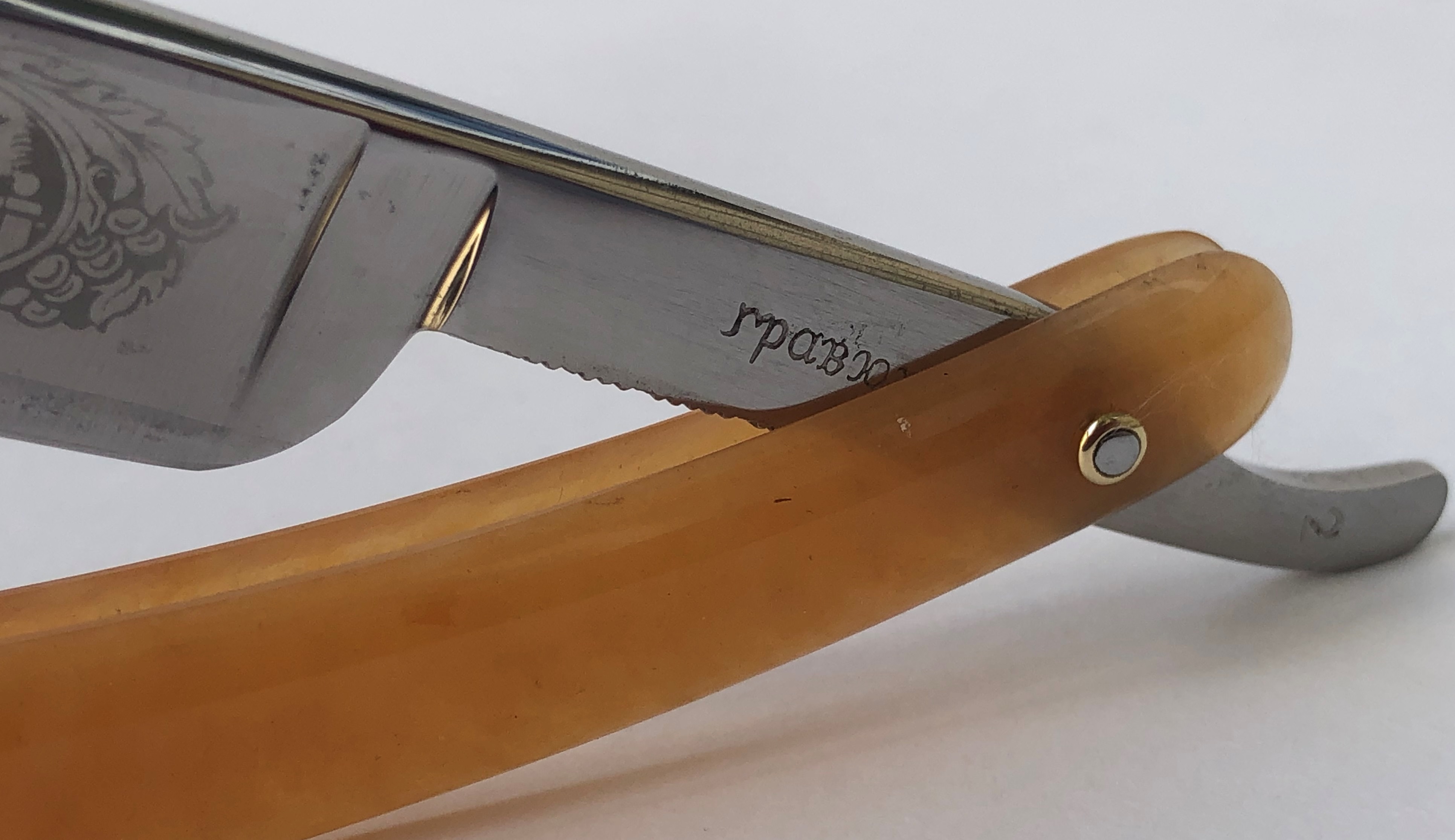 (Хотел обратить внимание на нечеткий штамп.Это заводской нюанс, а не стертость в результате чистки. Есть у меня в коллекции совершенно новая бритва с таким же дефектом, а также ранее попадались 2х-заковные с тем же самым.)