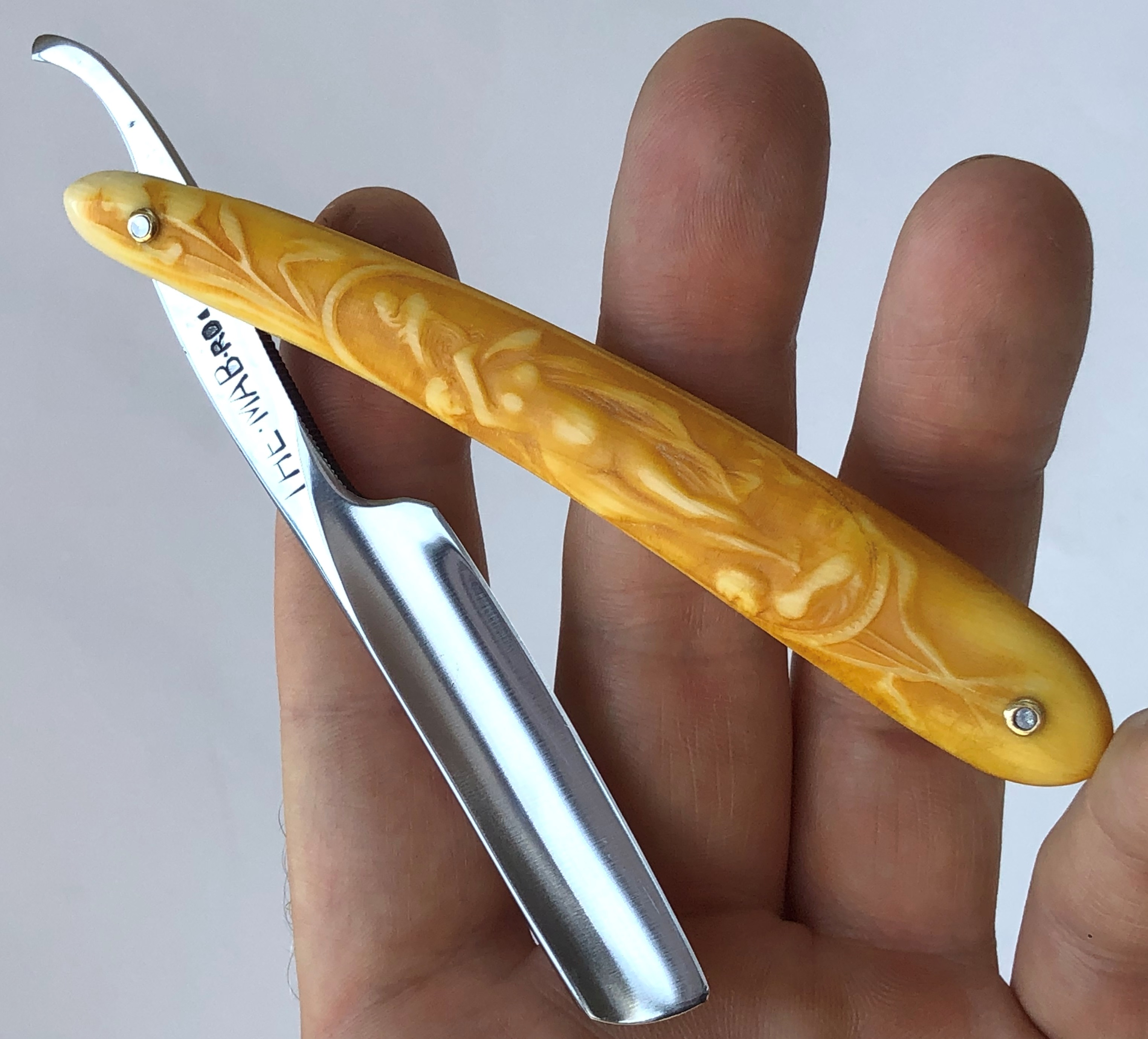 Ширина полотна-17.8 мм. Толщина обушка-4.9 мм. Полная вогнутость. Углеродистая сталь. Бритва в идеальном состоянии, без следов пользования.Была разобрана, для удаления осевых царапин на эрле.Также добавил внутренние шайбы, для надёжности.Неплохая геометрия клинка. Сталь чистая от дефектов.Родная коробочка. Перед отправкой будет окончательно доведена до состояния бритья. Цена-4800 р с доставкой.ПРОДАН Внимание! Важная информация! Spoiler Show