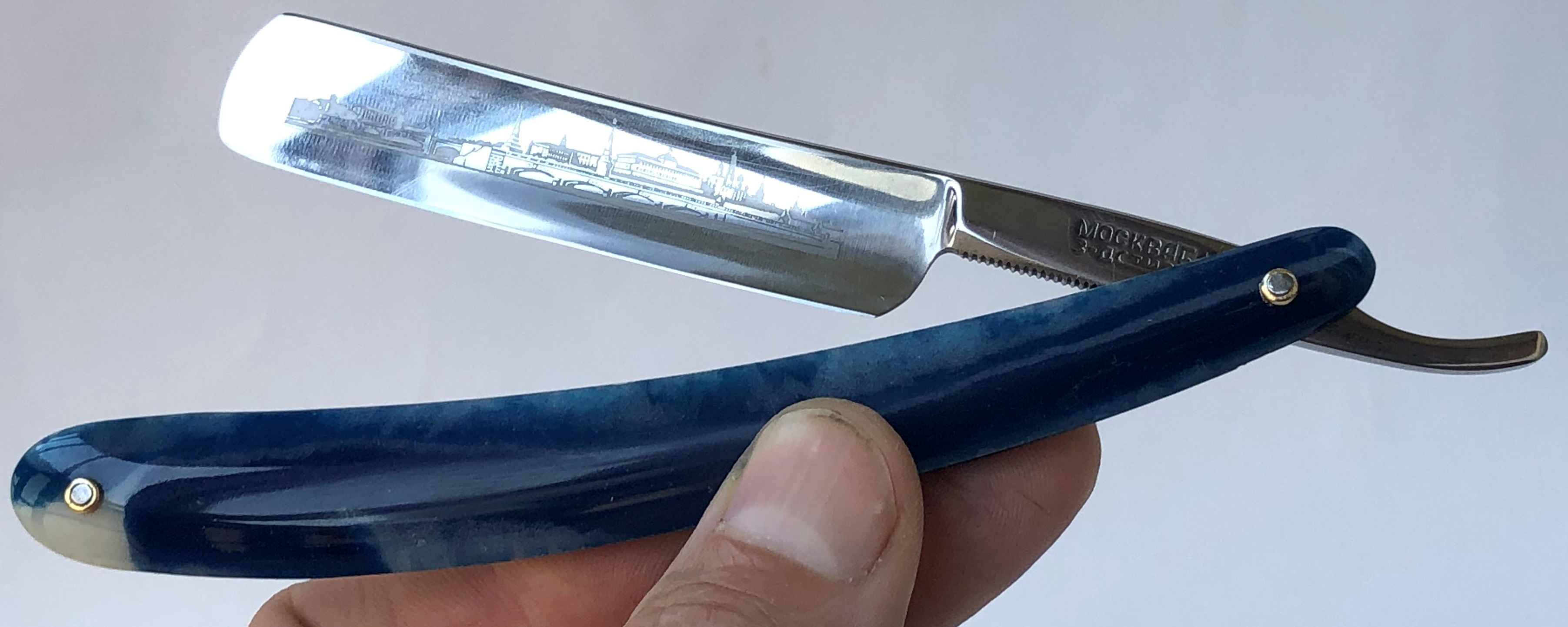 Ширина полотна-19.7 мм. Толщина обушка-6.0 мм. Полная вогнутость. Углеродистая сталь. Бритва в хорошем состоянии, аккуратно пользованная.Лицевая сторона с элементами патины, но зато сохранен оригинальный рисунок.Заднюю сторону пОлотна немного освежил и умеренно отполировал. Поменял пины на двух-цветные втулки и добавил внутренние шайбы.Кромочка равномерна по всей длине.Достаточно тяжёлая бритва.Неплохой и относительно недорогой вариант для новичка. Заточена и готова к бритью. Цена-8500 р с доставкой. Внимание! Важная информация! Spoiler Show