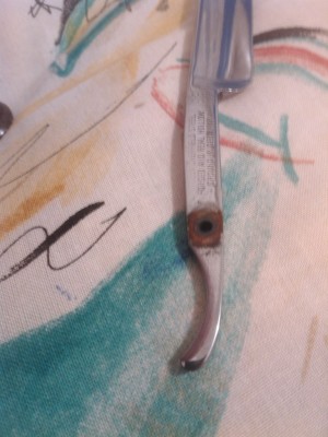 Re: Ржа, туды её в качель...Как писал камрад Bombadil - ржа в области верхнего пина - зло. Боролси сегодня... Коллега пользовался уточенным Swordplay около года - контуры ровнял у бороды. "Подсела" бритва, принес грит, поточи. Перед заточкой немного решил полотно Autosoloм освежить, потом стал точить - а бритва "гуляет", пин разболтался. Подбивал-подбивал, а в итоге пин вылез. Не очень-то английский джентельмен-реставратор старался. Ну и королева с ним, урвал за недорого