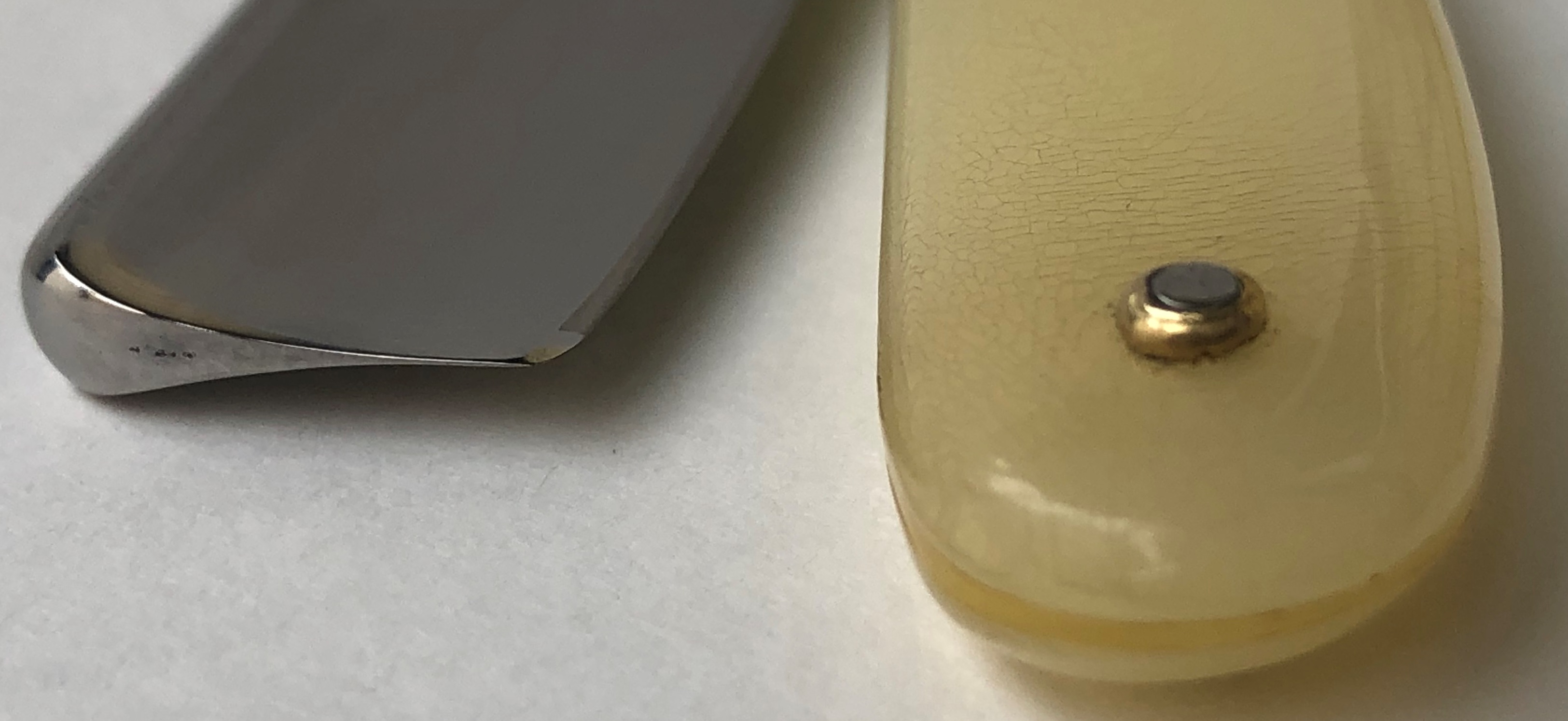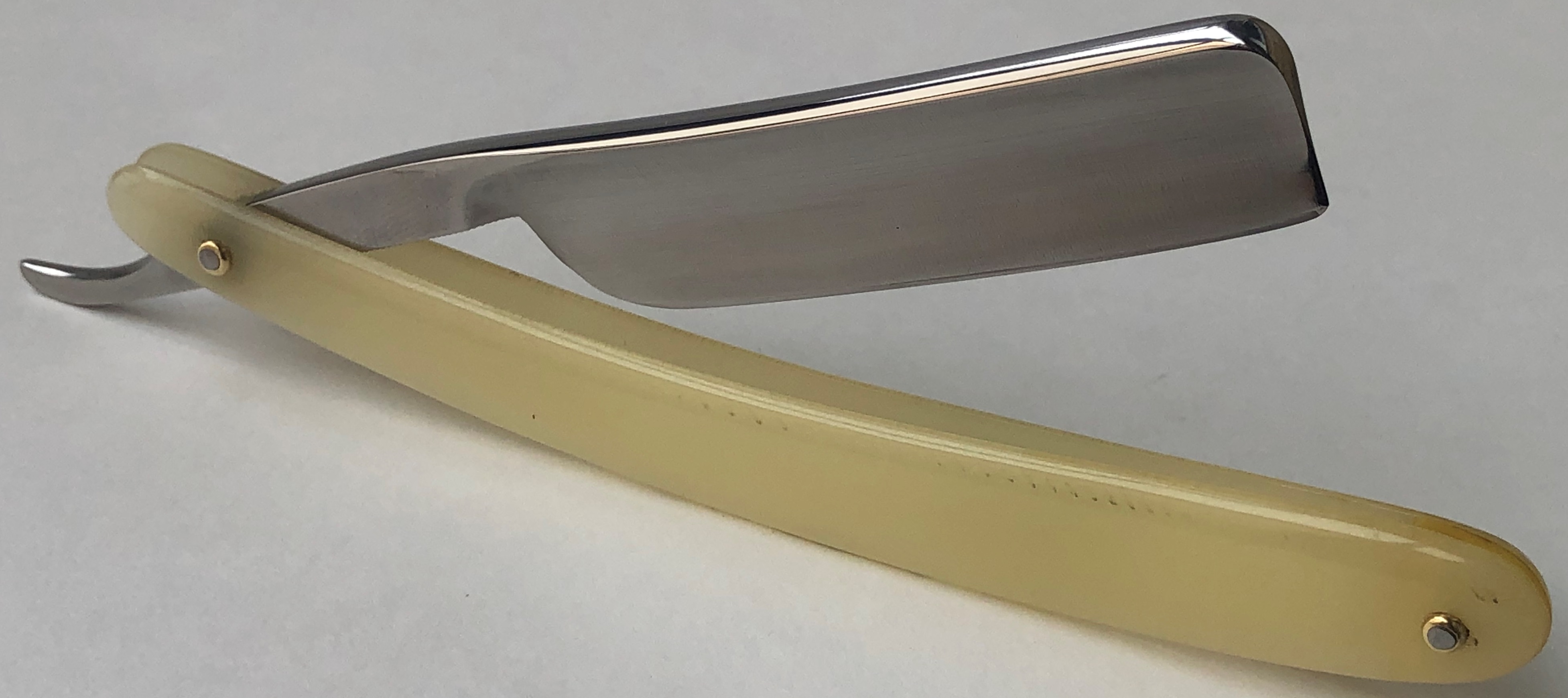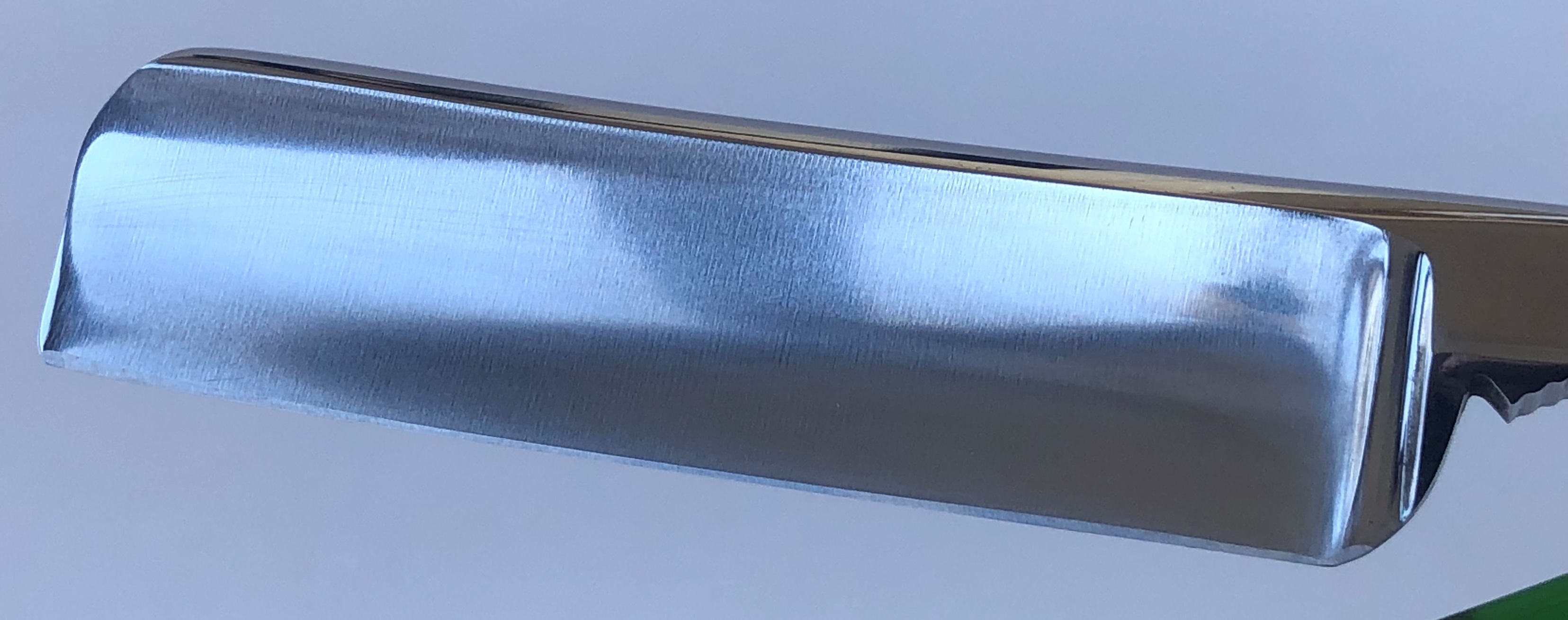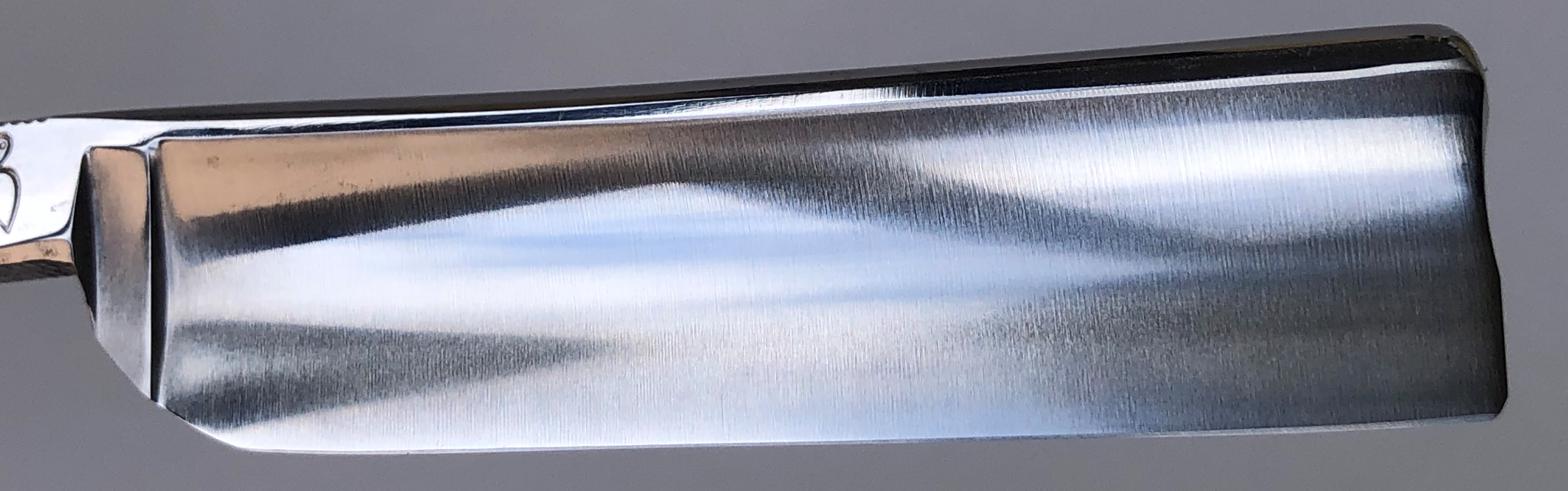 Бритва прибыла из Японии, но на японку совершенно не похожа. По всей видимости все таки немецкая.Лицевая сторона оригинальная, тут ничего не делал. Обратную сторону немного освежил от царапин и патины. Осевой перебрал , добавил внутренние шайбы и заново установил родной пин.Эффектный ажурный обушок,редко когда представленный на опасных бритвах. Идеальная геометрия полотна:кромочка равномерна по всей длине.Тяжёлая, с неплохой сталью и во целом красивая бритва. Будет заточена и подготовлена к бритью.