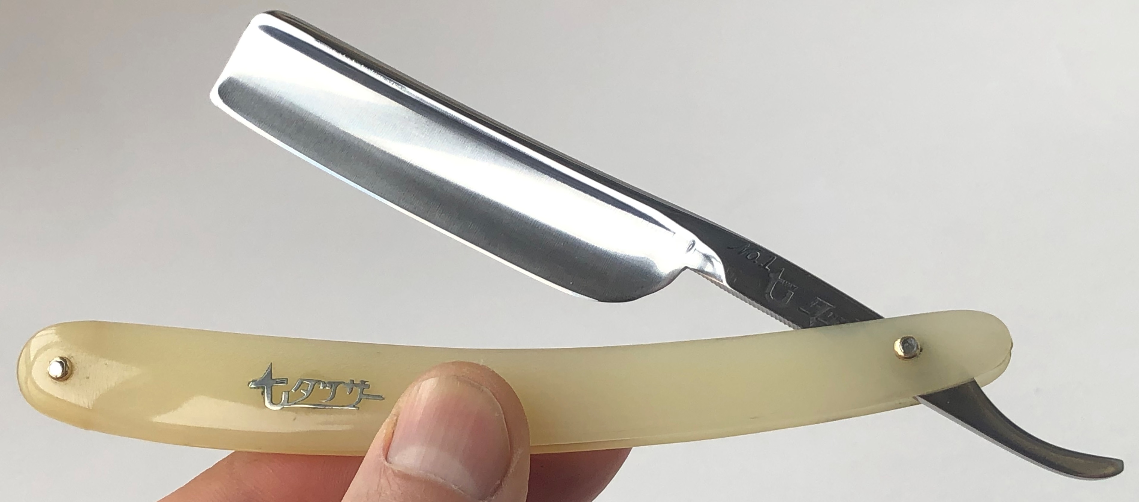 Бритва исключительного состояния.Как будто вчера с завода.Была оттерта от масла с консервации.Ничего не разбиралось и не ремонтировалось. Никаких работ не производилось, даже ручной полировки. Идеальная геометрия клинка:кромочка равномерна по всей длине и практически незаметна.За счет своего толстого обушка бритва достаточно тяжелая и хорошо ощущается в руках.Сама бритва представляет классическую японскую модель, созданную в евро стиле.Коробочка тоже новая, но от другой бритвы.Перед отправкой будет переточена до состояния комфортного бритья.
