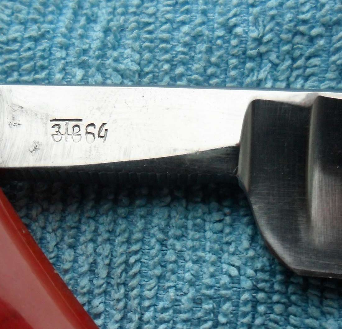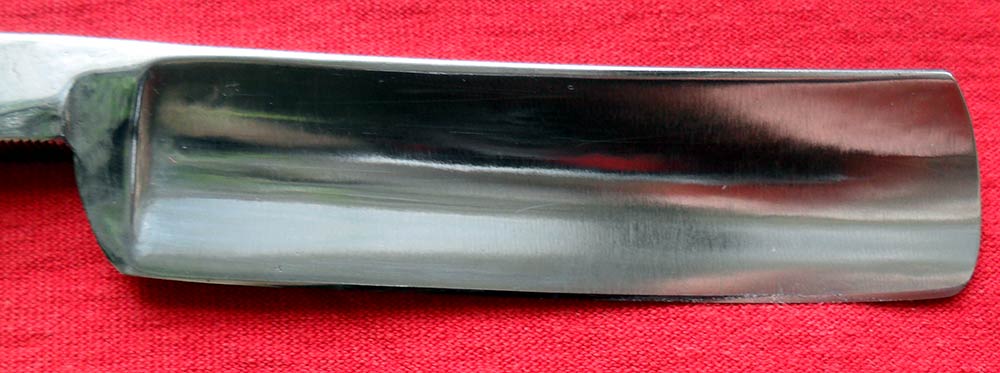По всей видимости, ручка родная, эбонит. Ширина бритвы 20 мм, толщина обуха 5 мм.