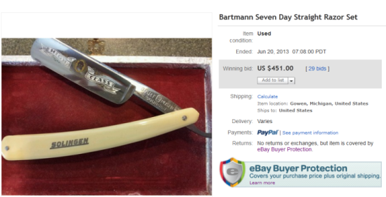 Re: Kronenberg SolingenНаборы в таком состоянии и от неизвестного производителя не могут столько стоить. В наборах бывают обычно 7 бритв(неделька), а тут целых 10 штук, видимо это не набор а подарочная упаковка. Если нет клейма производителя, то ценность не велика, если все целые бритвы, без потерь, то на Ебее может за 400 $ продадутся, а вот за 1000 $ , ой, я вас умоляю. Вот вам пример: http://www.ebay.com/itm/DOVO-VINTAGE-ST ... 9231919%26" onclick="window.open(this.href);return false; И ещё: Re: Kronenberg SolingenЖелание продать конечно есть, но не такое сильное (все мы немного люди алчные). В первую очередь хочется понять откуда данное чудо появилось, поскольку я знаю, что мой прадед занимался реставрацией антиквариата в 30 х годах, и имел внушительную коллекцию, которая, к сожалению, была либо разворована, либо конфискована в не лёгкие годы войны.