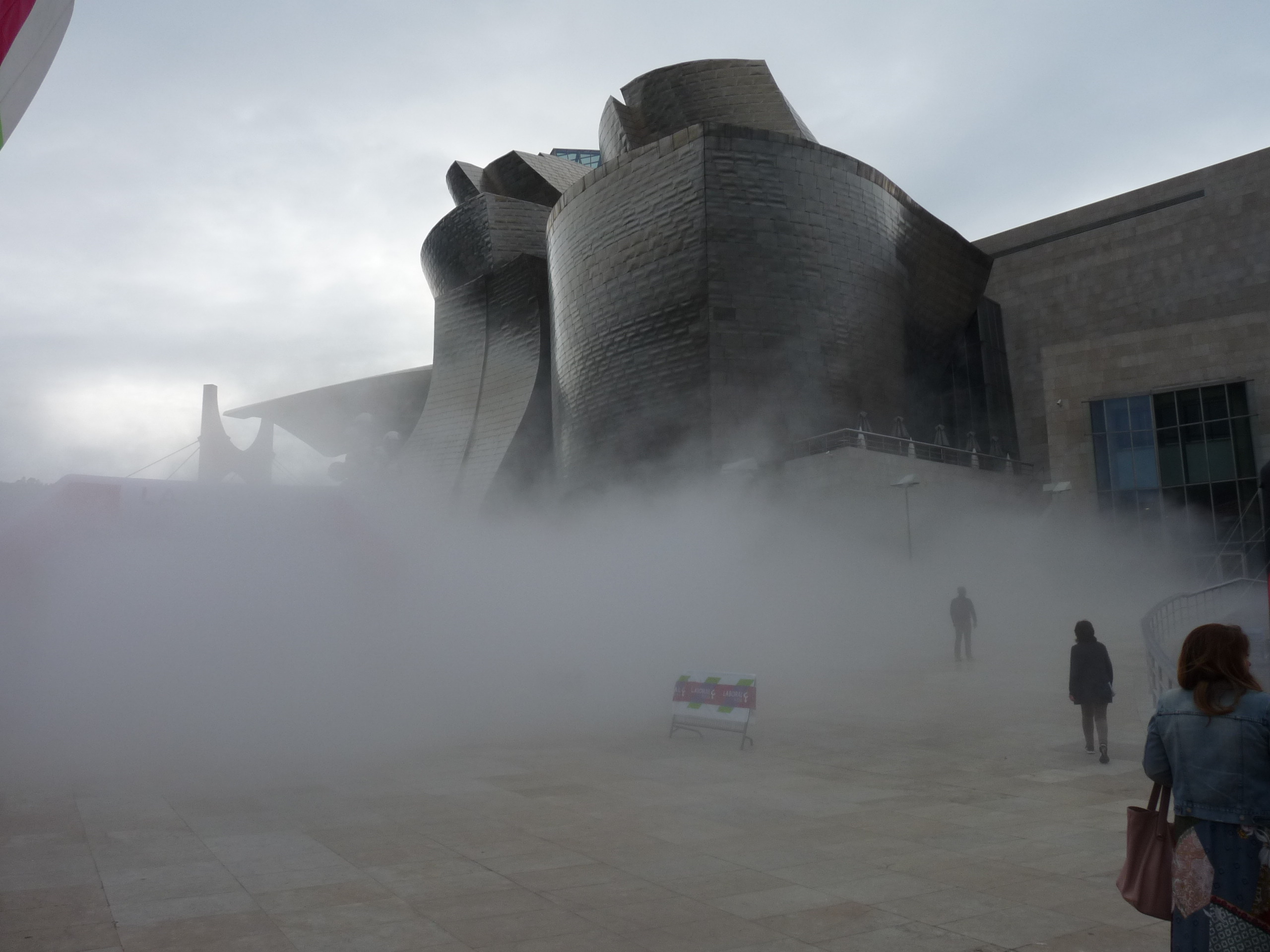 Для замирения басков (как элемент вовлечения) в 1997г. центральное правительство Испании (на бабки евросоюза) построило музей современного искусства Гугенгейма (нафига тут американские названия?) в Бильбао, исторической столице басков (сайт музея -https://www.guggenheim-bilbao.eus/en) . Здание в виде то ли корабля, то ли рыбы. Облицован нашими титановыми пластинами - как и "Ракета со спутником " на (перед) ВДНХ, 1957г., которая. Каждые два/три часа пускают пар/туман, ну типа "корабь плывёт по реке" (на фото видно). На берегу реки стоит музей, ибо. На открытие этого музея решили сделать гигантскую (13м в высоту) цветочную собаку (см. фото) перед входом, таки должен был быть на открытии музея испанский король Филипп. Ну и таки эта ЭТА заминировала эту собаку тонной взрывчатки (дабы королям не повадно было к баскам ездить, как к себе), но намерения были раскрыты, чуть постреляли (даже убили полисмена) - терракт не получился, ибо всё произошло "до" церемонии открытия. Но, в назидание центральным властям (и королям), горожане Бильбао решили собаку не демонтировать - вот так и стоит теперь (см. фото). Народ в розовых майках на фото - типа марафон (!) для сбора средств по теме борьбы с раком сисек, каждая майка = 10е., даже на собак - розовые собачьи майки - вешали, очень много народа было, десятки тысяч, не знаю, как марафон, но побежали все, добежали ли все...?, но это и не важно. Аскуна центр - бывшее зернохранилище переделанное в выставочный центр, на крыше которого бассейн, а пол бассейна - прозрачный, и народ, гуляющий в центре, видит на потолке плавающих на крыше! (ну мне понравилось, необычно).