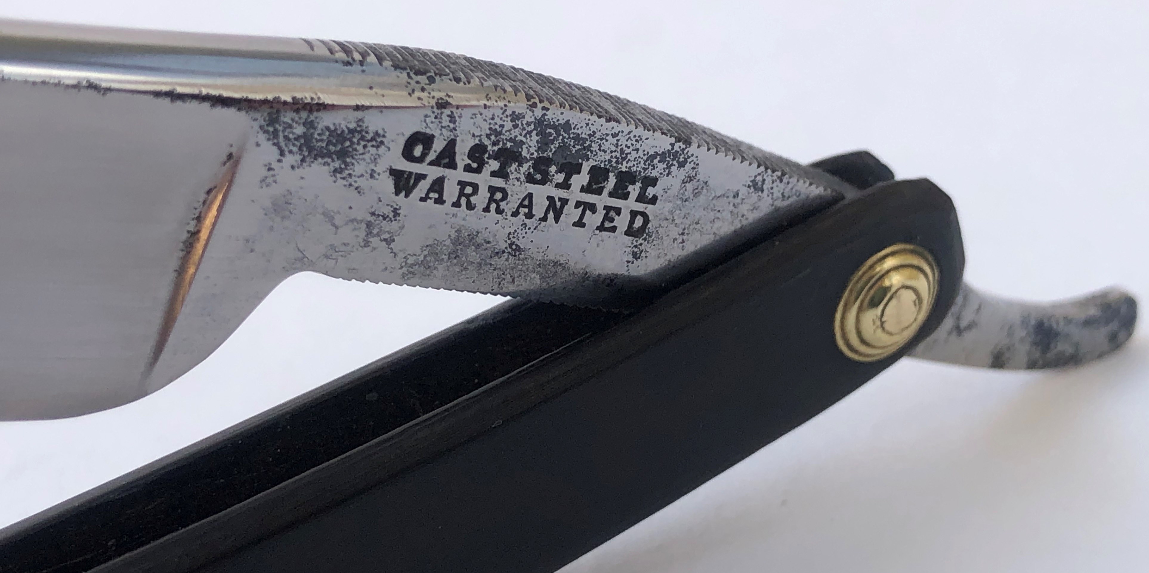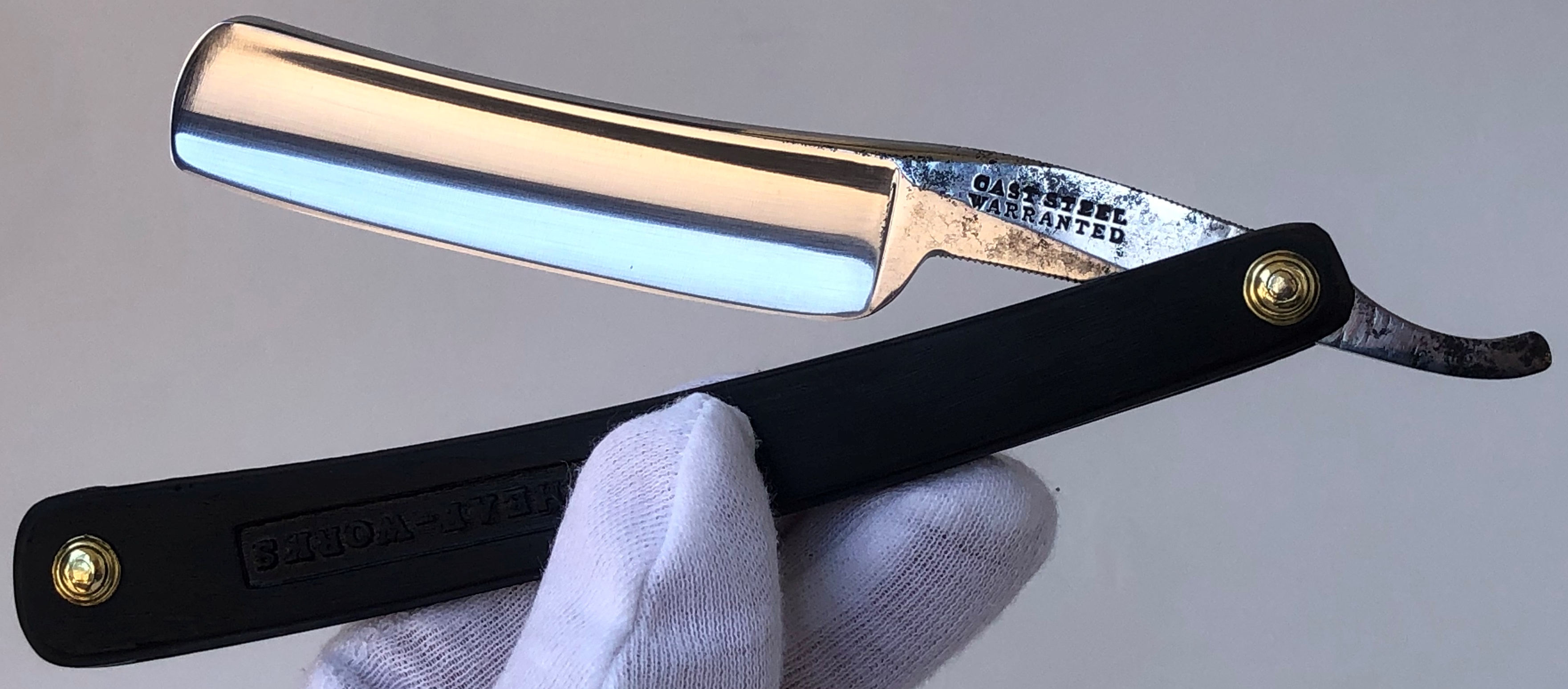 Клинок сохранился очень хорошо.Лично мной бритва не разбиралась,но ручка явно неродная. Тут присутствует пропитанное чем то дерево.Качество изготовления и общий вид оправы приличный, поэтому не стал ничего тут менять, а оставил как есть. Также,была оставлена эффектная старинная патина, скупе с вычищенной питтинговой,неглубокой коррозии,которая придаёт естественный вид бритве, возраст которой уже стремится в 200 годам.