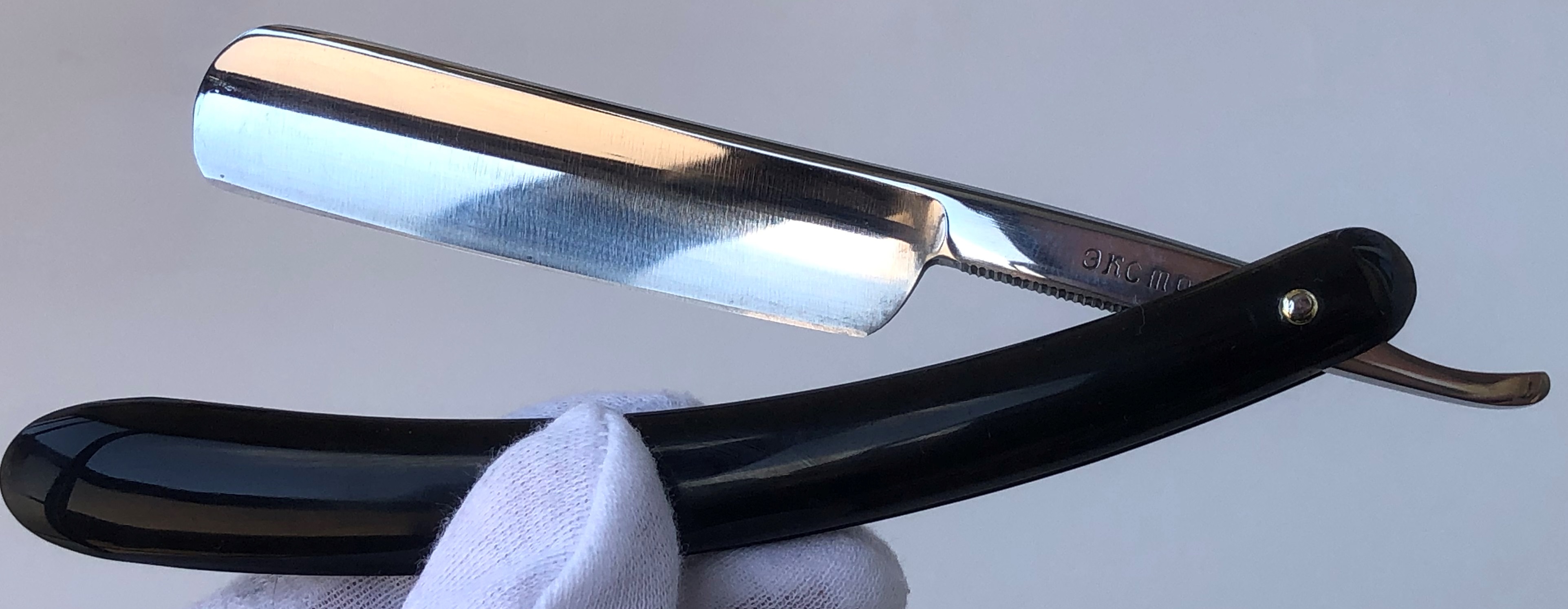 Бритва в идеальном состоянии и заточена была впервые,без изоленты.Идеальная геометрия полотна:кромочка равномерна по всей длине.Бритва создана из цельного куска металла, а не более классическим способом,из двух сваренных частей.Родная резиновая ручка также в отличном состоянии.Очень неплохой и достаточно недорогой экземпляр в коллекцию.