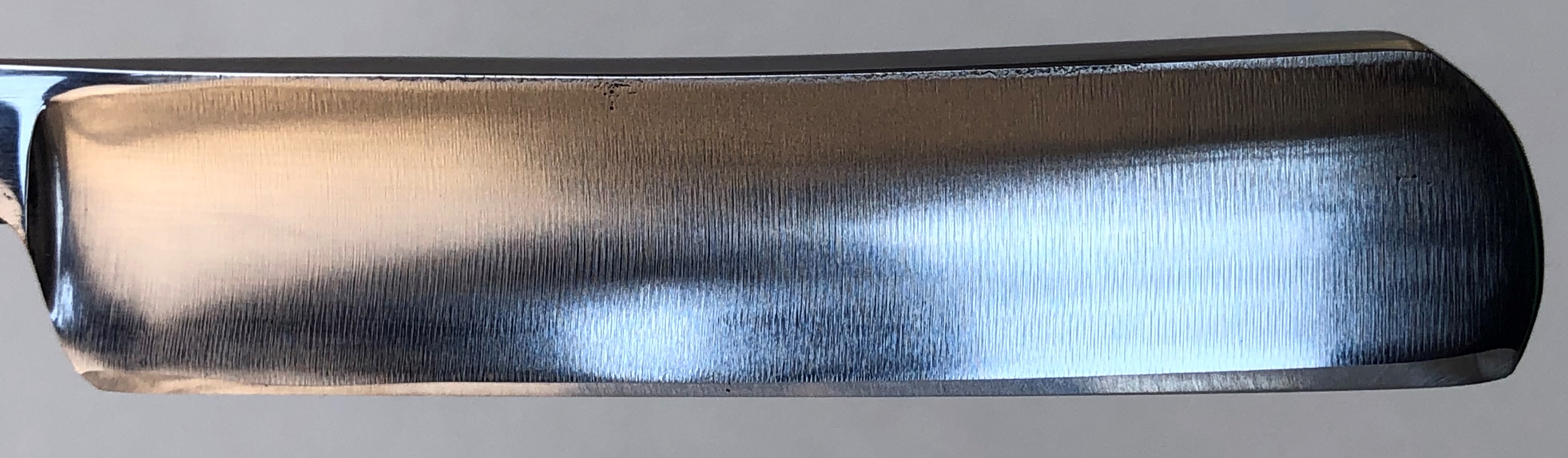 Бритва была разобрана, клинок по мере возможности приведён в порядок.Умеренная полировка. Кромочка немного широковата,но почти равномерна по всей длине полотна.Новые двух-цветные втулки и внутренние шайбы. Родная роговая оправа в хорошем состоянии,без критичных дефектов,но нужно сделать скидку на преклонный возраст материала.Но, внешних расслоений, трещин и разгрызанных мест нет.Удобная форма лезвия клинка. Бритва достаточно тяжёлая.