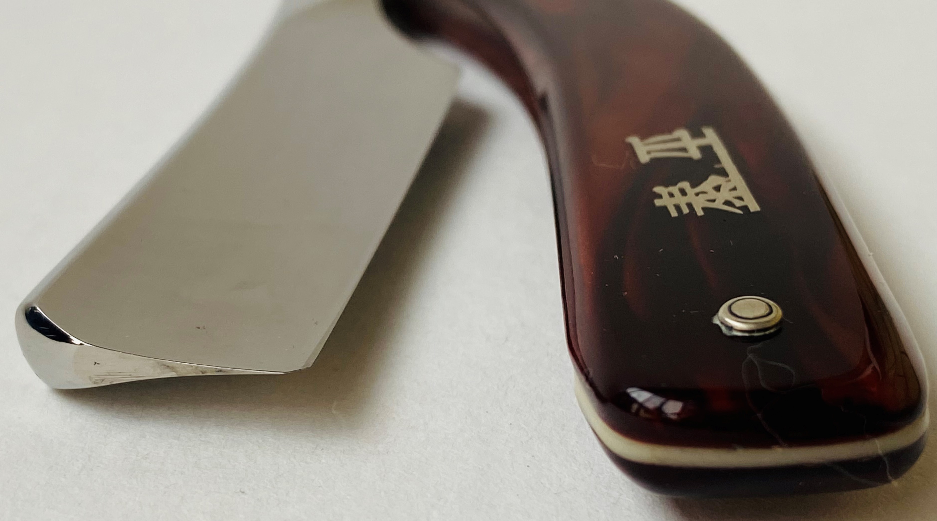 Бритва не часто встречаются в таком состоянии. Без следов пользования. Была разобрана, для удаления следов окисления, в районе осевого пина, а также освежения самого полотна. Идеальная геометрия клинка:кромочка равномерна по всей длине.Достаточно тяжёлая.Новые пины и внутренние шайбы. Оригинальная оправа "под черепаху".Как часто тут происходило,плашки достаточно узко сведены между собой, но клинок не закусывает.Родная коробочка.