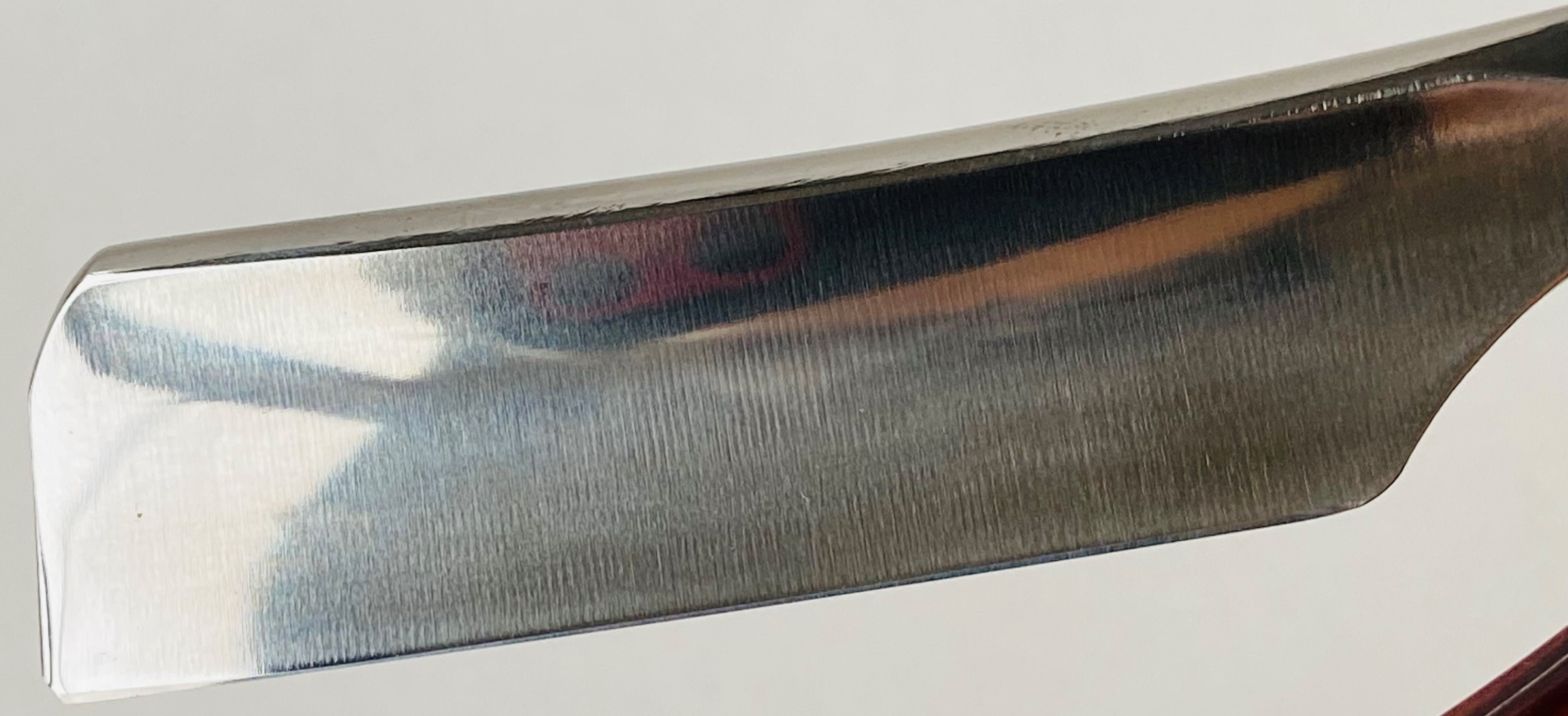 Бритва непользованная, но была подвергнута минимальным,косметическим работам.Умеренная шлифовка и полировка. Впервые вижу Вачу и такой шириной клинка.В общем и целом бритва достаточно крупная и тяжёлая.Новые втулки и внутренние шайбы.Кромочка почти равномерна по всей длине.Заточена и готова к бритью.