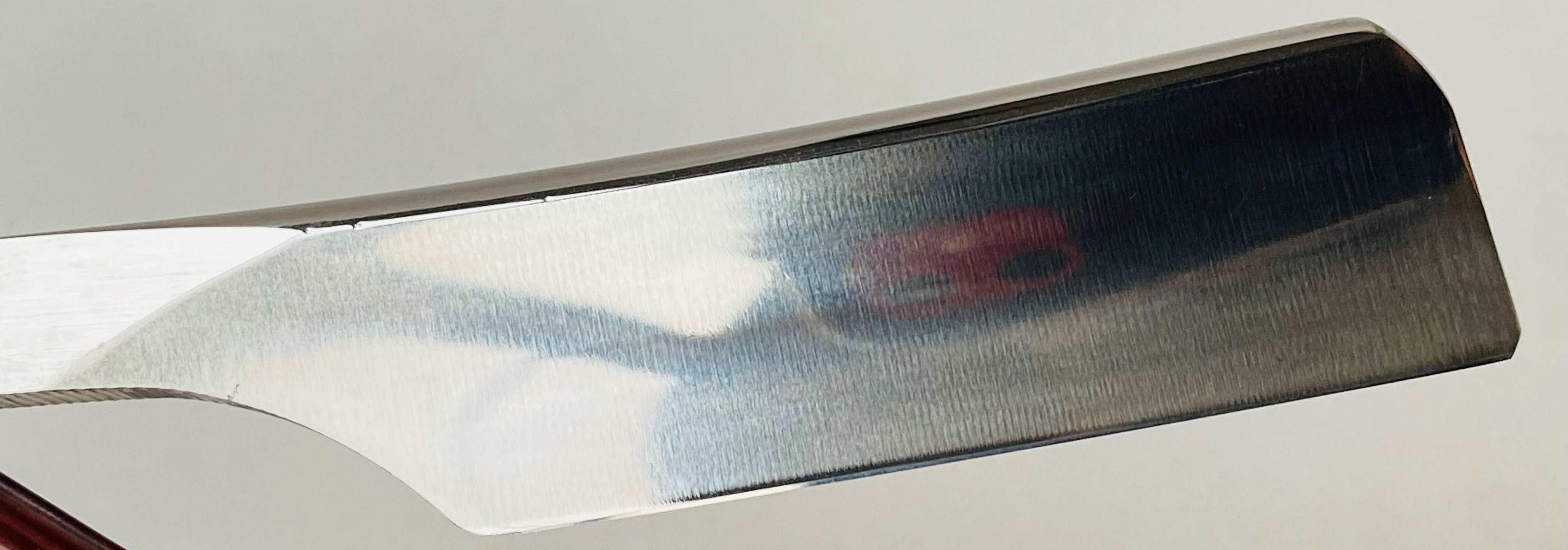Бритва находится в прекрасном и малопользованном состоянии. Красивый,высококачественный парикмахерский инструмент. Бритва была разобрана,для удаления многолетней патины,без глубоких работ.Гравировка четкая,без потертостей.Идеальная геометрия полотна:кромочка равномерна по всей длине.Оригинальные пины были перебраны и аккуратно установлены обратно,с добавлением внутренних шайб.Родная коричневая краска оправы не стерта также.За счет своего толстого обушка бритва действительно тяжёлая,что дает возможность чувствовать её в руке и не резаться часто. Также при таком толстом обушке можно пробовать бриться, не выставляя угол атаки,а просто класть клинок плашмя на лицо,по барберски.