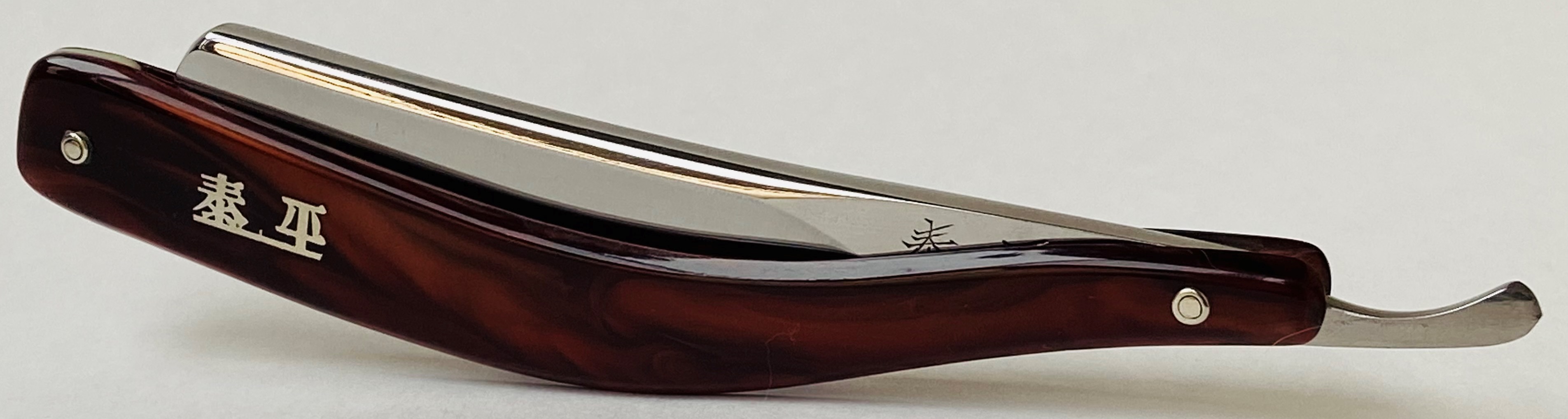 Находится в прекрасном,совсем незаметном пользованном состоянии.Была разобрана,для минимальных косметических работ,с сохранением родных пинов и внутренних шайб.Умеренная шлифовка и полировка.Четкая гравировка, без потертостей.Эффектная,элегантная и достаточно не часто встречающаяся форма клинка для японских производителей прошлого.Идеальная геометрия:кромочка равномерна по всей длине.За счет своего толстого обушка бритва тяжёлая.Также,красивая, толстая и надёжная родная ручка.Высококачественная углеродистая "звонкая" сталь, способная выдавать чистое и комфортное бритье.