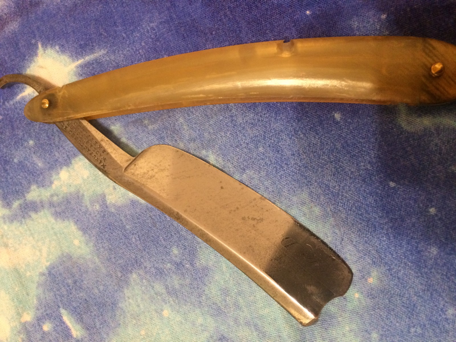 Насколько я знаю, это старая английская бритва из Шеффилда. По словам продавца, это конец 19 века. Но почему она такая "толстая", семь с небольшим мм, я имею в виду толщина обуха? Интересует примерный возраст и стоимость. Рукоять из рога, всего одна небольшая трещинка у пина. Да и вообще, накидайте информации побольше!