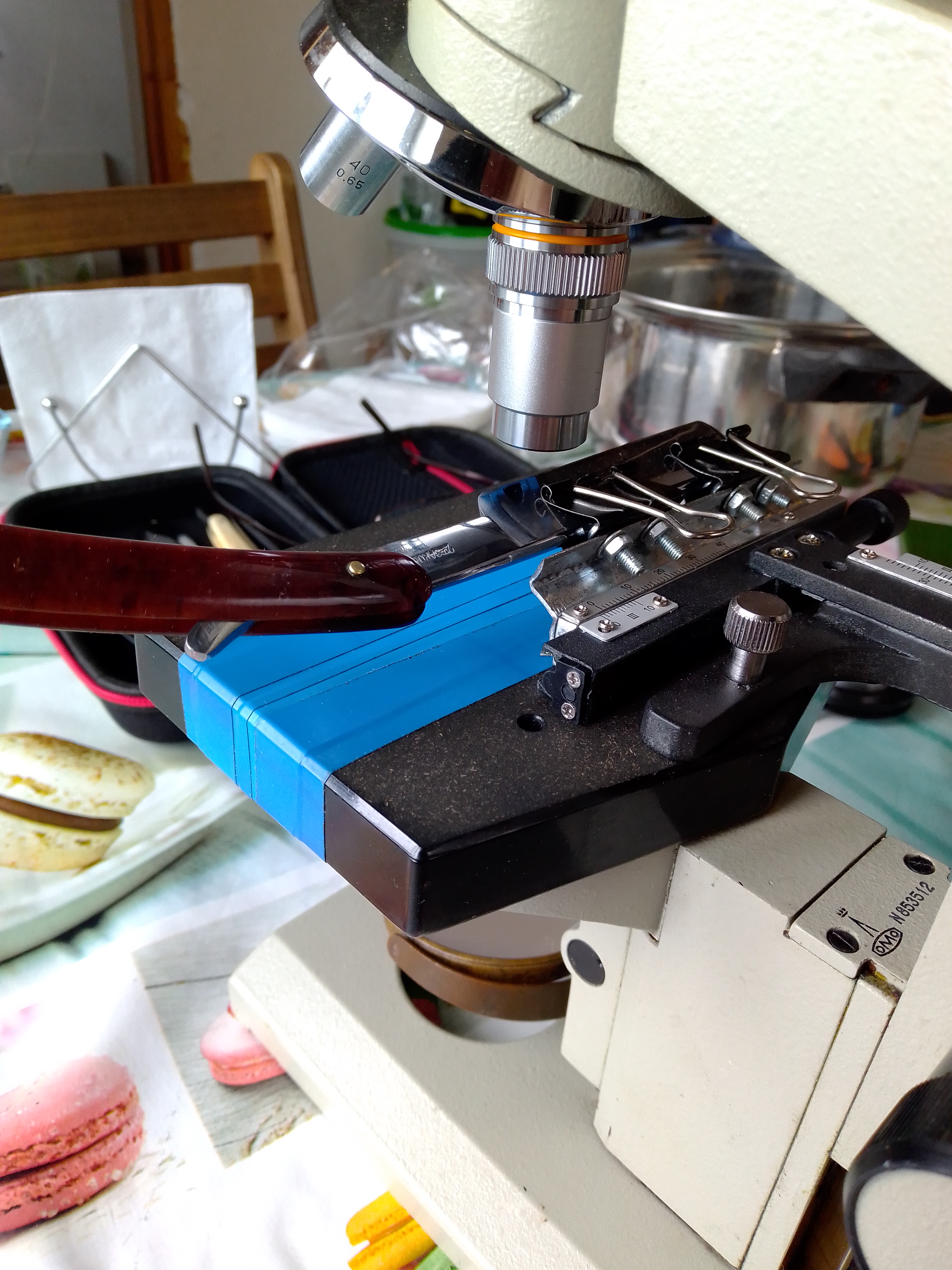 Поделюсь доработкой микроскопа - механической системой прокрутки, позволяющей комфортно рассматривать режущую кромку . В связи с дороговизной координатного столика нашего производства, на алиэкспресс был куплен координатный столик (поиск на Алиэксспрес по словам: Attachable Mechanical Stage X-Y). На котором были откручены держатели стекол. Вместо держателей прикрутил кронштейн из оцинковки с канцелярскими скрепами. Главное на кронштейне выгнуть правильно углы. В качестве информации окуляр использую х7. Объективы: в основном х8, в случае если нужно лучше присмотреться, то переключаюсь х10. Вполне хватает. У нас три времени года: грязь засохла, грязь намокла и грязь замерзла.
