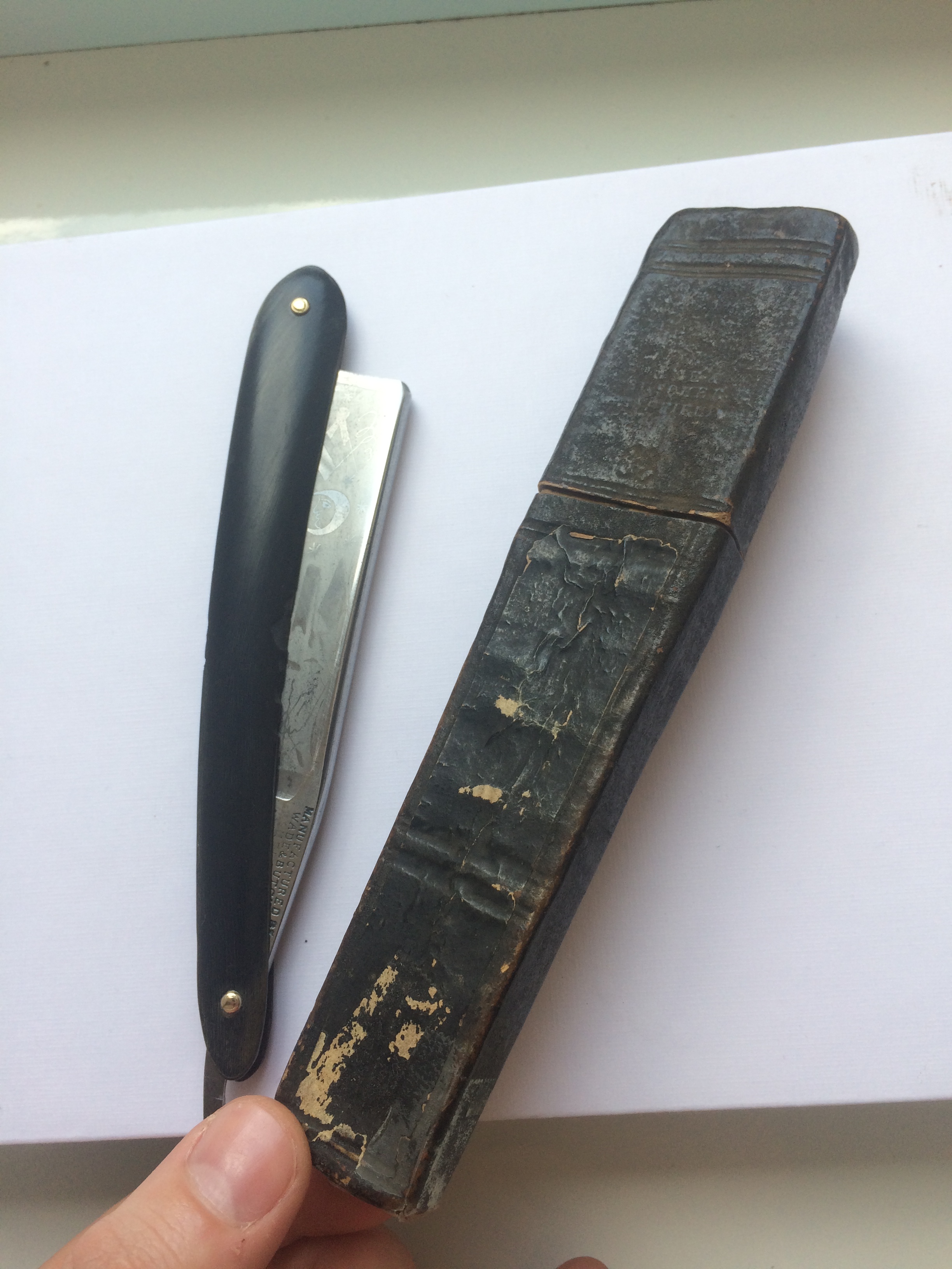 Насколько я знаю, это старая английская бритва из Шеффилда. По словам продавца, это конец 19 века. Но почему она такая "толстая", семь с небольшим мм, я имею в виду толщина обуха? Интересует примерный возраст и стоимость. Рукоять из рога, всего одна небольшая трещинка у пина. Да и вообще, накидайте информации побольше!