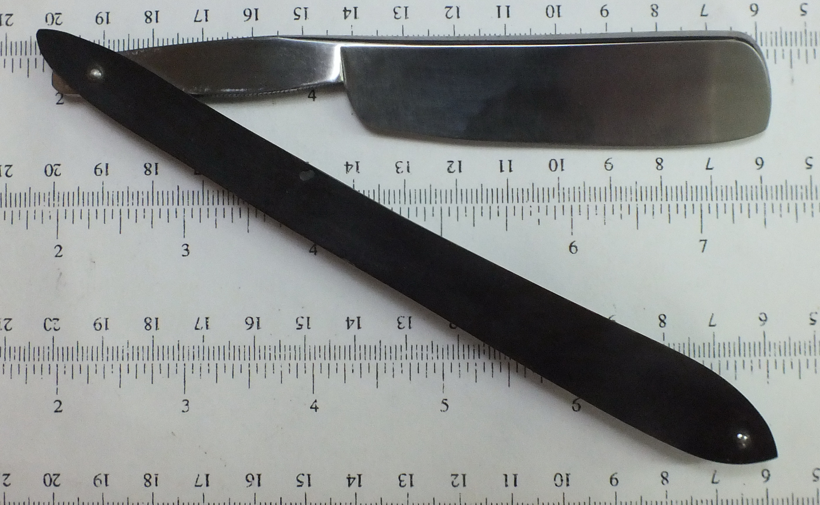 Bosson A Lion. 200++ летний авторский бесхвостик. 6/8 Near wedge. Углеродистая сталь, рог, кость. Бритва после реставрации. Следов времени на клинке нет. Оправа родная. Имеет три выщербинки до 2х мм. Бритва заточена и готова к бритью. На моё субъективное мнение бреет превосходно, как все старые англичане и французы (допотопные (до1842 г.) Продано Spoiler Show