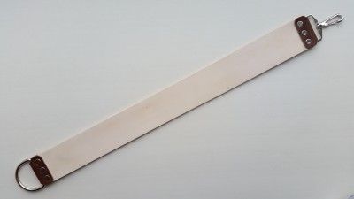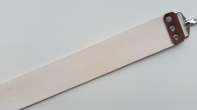 Ремень для правки, шириной 51 мм, уцененный. Длина стандартная (50 см), толщина кожи 3.4 мм, кожа итальянская КРС растишка. Из боковой части чепрака, где изначально кожа была с нарушениями. В нижней части есть морщины, есть желтоватые участки, но кромка бритвы и ладонь проходит без ощущений, править будет (хотя, лучше бы он подошел для ножей). Обработан, смазан костным маслом, готов к правке, поверхность тактильно чуть шершавее, чем на стандартных моих ремнях. Цена - руб. Spoiler Show