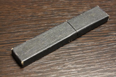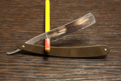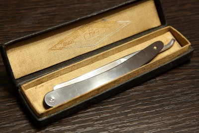 Опасная бритва завода Труд Вача Росинструмент, изготовлена в довоенный период (т.к. в 41 уже начали год на эрле ставить), из ранних, примерно 36-37 г. Ширина полотна 16 мм, все родное, футляр-сундучок от раннего СТИЗ. Вручную почистил и заточил. Подготовлена мной к бритью. На полотне остались следы времени (кромка чистая и без дефектов). Ручка оригинальная пластиковая, сталь тут старая традиционная, отличное удержание кромки, профиль близок к клину - то что нужно для жесткой щетины. Кромка бритье чувствуется на лице отчетливо. Цена - руб. К бритве рекомендую приобрести ремень для правки опасных бритв моего изготовления из итальянской кожи (подробнее на странице 4, объявления 56-58 и странице 9, объявления 127). Spoiler Show