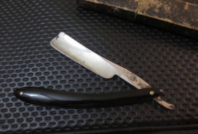 Прокладкой между частями ручки служит свинцовый металл. К сожалению, такие перламутровые ручки довольно хрупки. Большая удача для современного коллекционера – найти образец этой красивейшей ручки без трещин и сколов. Мне повезло найти две такие бритвы, но обе были со сломанными ручками. Было отмечено, что ручки были разных размеров под разную ширину бритв.