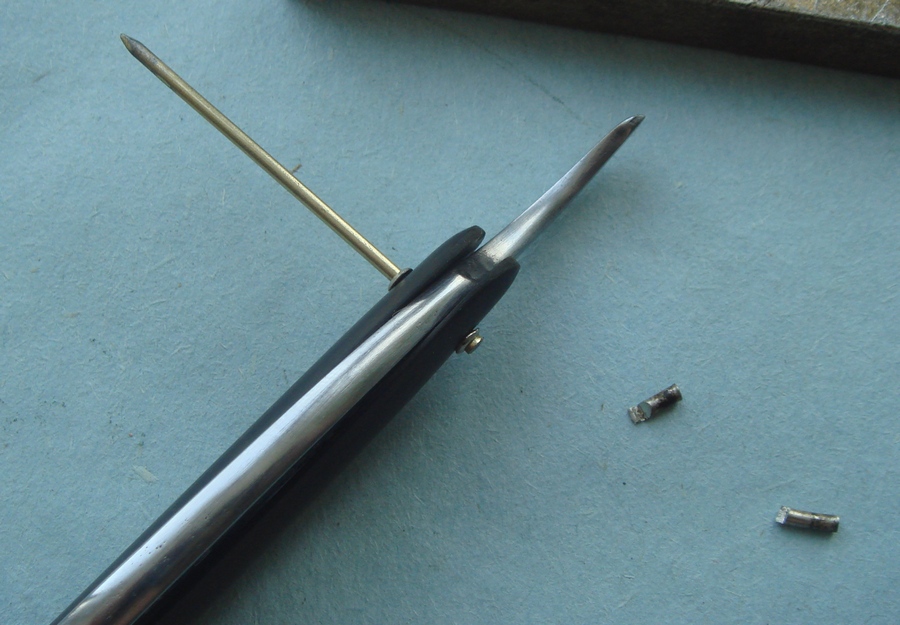 Re: Ремонт "перекоса" полотна в оправе.Здравствуйте . Возможно пишу не в ту тему( Олег Бритва поправит),но хотел бы предоставить небольшой фотоотчет по так сказать уплотнению клинка в оправе. Много раз попадалось при мелких ремонтах несоответствие отверстий (оправа-клинок).Раньше решал проблему путем вытачивания вручную из латуни или меди клепки с утолщением в середине. Но вот на днях купил в стройматериалах латунные финишные гвозди 1.5 и 2.0 мм.,пришлось искать другое решение. Может кто-то уже опробовал такой способ ,сразу хочу извиниться. Думаю наглядность полезна,может кому пригодится