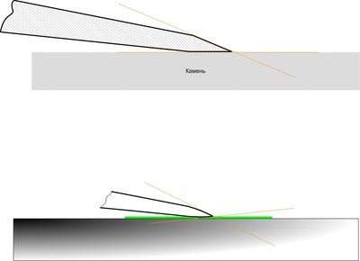 На верхнем рисунке точится на твердом и ровном абразиве. Угол соответственно получается максимально острый для данной бритвы На нижнем рисунке заточка на твердом основании, но с применением абразивных паст ( алмазы и тп). По своему небольшому опыту скажу, что при движении в направлении острия образуется волна из пасты с абразивом, которая естественно будет точить кромку, соответственно угол заточки будет не таким острым, как в первом случае. Мне кажется что спуски будут линзоваться уже ближе к кромке. При заточке на абразивах типа наждачной бумаги спуски будут полностью линзовидными, из-за того что бумага имеет некоторую эластичность. Потом уже в процессе правки на коже с ГОИ и чистом ремне спуски все равно станут выпуклыми, но заточенная, как в первом случае кромку будет легче правиться и точить надо будет реже. Интересно будет услышать чужое мнение. Одним ударом дерева не срубишь. . Татарская поговорка