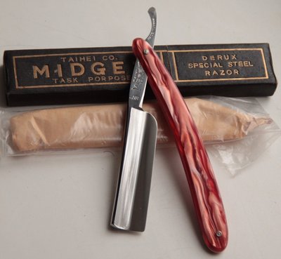 Бритва действительно очень красивая, с элегантными формами, но с тоже время с характером, благодаря своей форме лезвия, толстого обушка и своей массивности.Бритва не имеет активных следов пользования. Возможно, что вообще не была в пользовании. Но, бритву разобрал, немного освежил полотно, добавил внутренние шайбы и втулки. Ручка оригинальная.Идеальная геометрия полотна. Кромочка равномерна по всей длине. Сталь и кромка чистые.Исходя из своего опыта и отзывов моих многочисленных клиентов,японские бритвы подобной формы лезвия способны выдавать мягкое, чистое бритьё, приближенное к эталонному. Крупная, тяжёлая бритва..