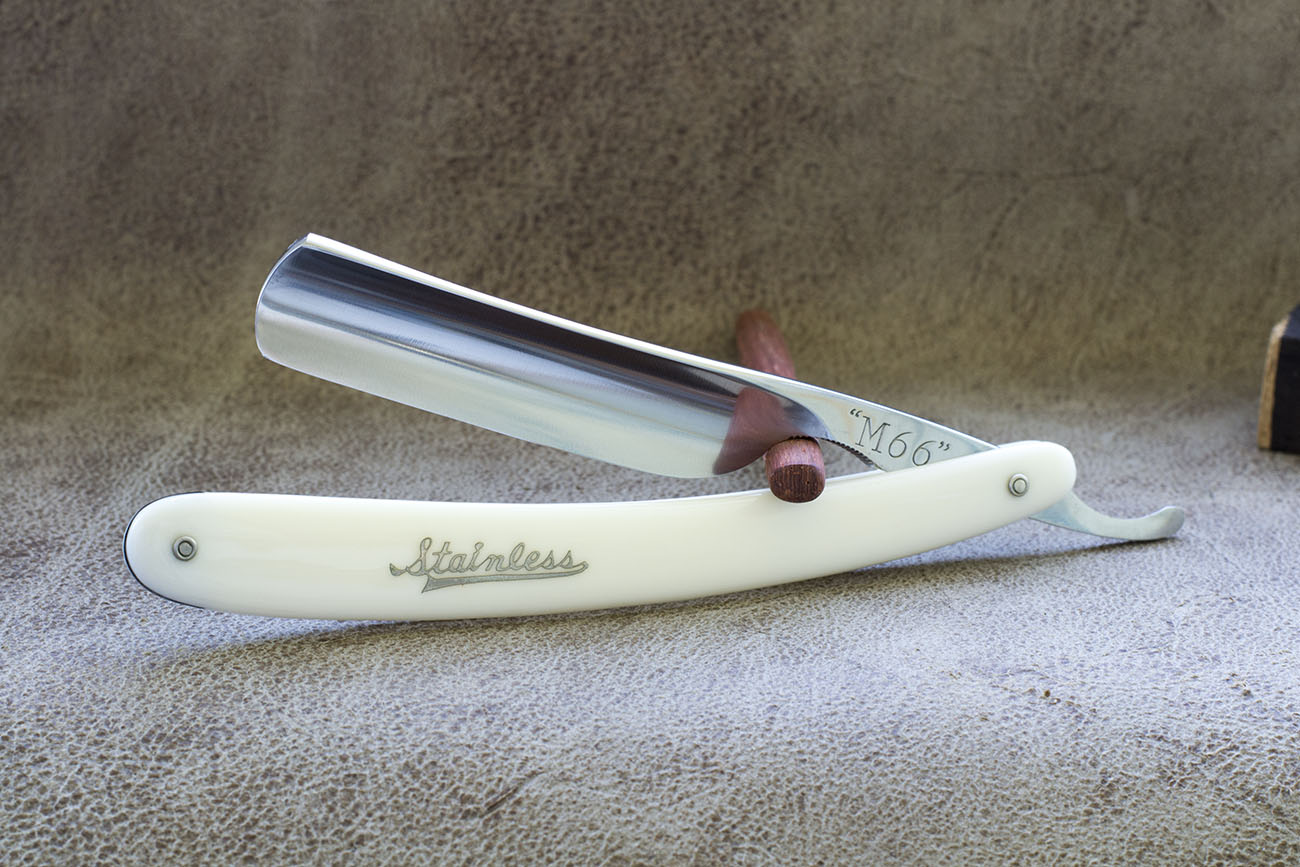 Редкий фрейм из Японии. Ширина полотна 21 мм (13/16). Обух 6 мм. У меня в коллекции несколько экземпляров, на спинке некоторых сохранилась позолота свидетельствующая что бритва изготовлена из Best JIS Stell (JIS- Japanese Industrial Standart), т. е. бритва изготовлена из стали японского производства а не из шведской как большинство фреймов. Заточка выявила прекрасную геометрию, сталь так же показалась мне очень приятной. Отлично подойдет для сбривания жесткой щетины. Не была в использовании но имеет небольшие следы времени не влияющие на потребительские качества. Бритва заточена и готова к бритью. Продано Morishita Show