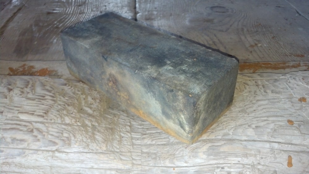 Здоровый, размером чуть больше кирпича. На вид тонкий, доводочный. Но не абсолютно гладкий, как сланец. Хотя я не спец ни разу. Снизу желтое - след от ржавчины, лежал на ржавой бочке в подвале. Предположительно использовался для доводки ножей для рубанков. Большие поверхности визуально абсолютно ровные. Есть смысл применять в бритвеном деле? Муссолини харь псевдозаточкой. Типазаточник-параллельщик. Баблосгрёб.