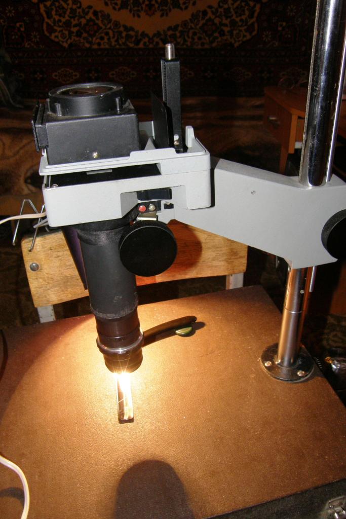 1.Снял верхнюю часть где находится лампа 2. вынул матовое стекло 3.закрутил объектив с промежуточными кольцами. Вот в принципе и всё. Увеличение немного не хватало поэтому взял кусок пластиковой трубы подлиннее, нагрел в горячей воде и запрессовал с одной стороны кольцо с резьбой. А с другой просто вставил и обмотал изо лентой. После закрутив в тубу объектив, в крутил в фотоувеличитель. Расстояние до бритвы зависит от фокусного расстояния самого объектива. Резкость наводится винтом резкости фотоувеличителя .Кратность увеличения зависит от длинны трубы. Чем труба длиннее тем сильнее увеличение но падает светосила самого объектива. Поэтому нужно увеличить освещение бритвы. Можно использовать лампу от фотоувеличителя или взять по мощнее, но лучше заменить светодиодным прожектором так как можно обжечь руки лампочкой. Наблюдение проводим через большие верхние линзы, на которые советую сделать переходную трубу в которую можно фиксировать фотоаппарат чтоб совместить оптическую ось. Вот мой нищебродский микроскоп , который я построил за 40минут. Так что пользуйтесь на здоровье может кому пригодится? Добавлено спустя 2 минуты 11 секунд: вот ещё Добавлено спустя 1 минуту 25 секунд: качество не очень трудно совместить фокус Добавлено спустя 50 секунд: нужно подбирать освещение Добавлено спустя 1 минуту 18 секунд: Ещё нужно заклеить ту щель где вставлялась плёнка Добавлено спустя 1 минуту 26 секунд: Качество фоток не передаёт всё то что увидишь глазами
