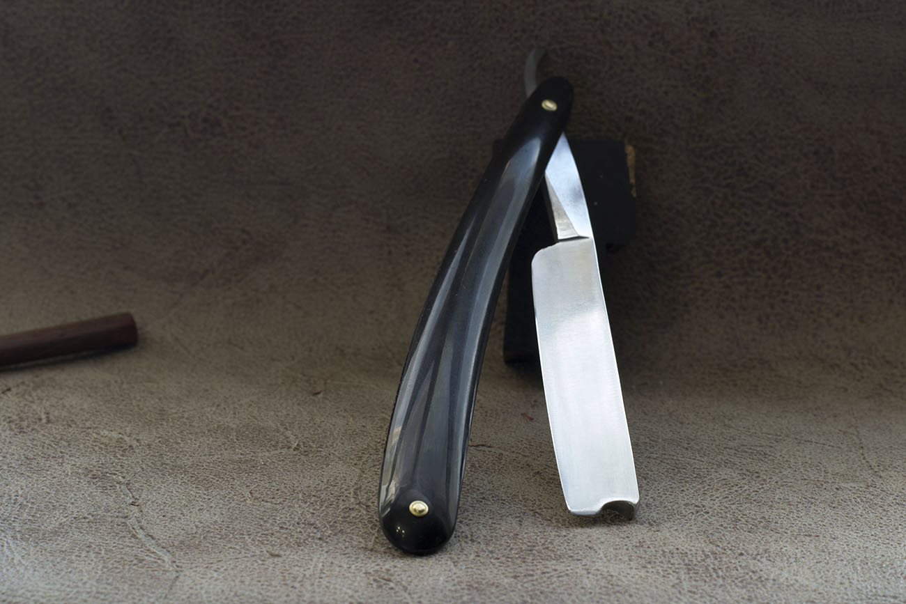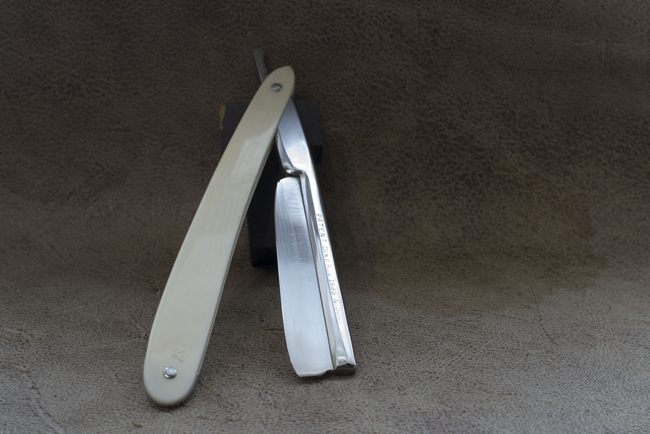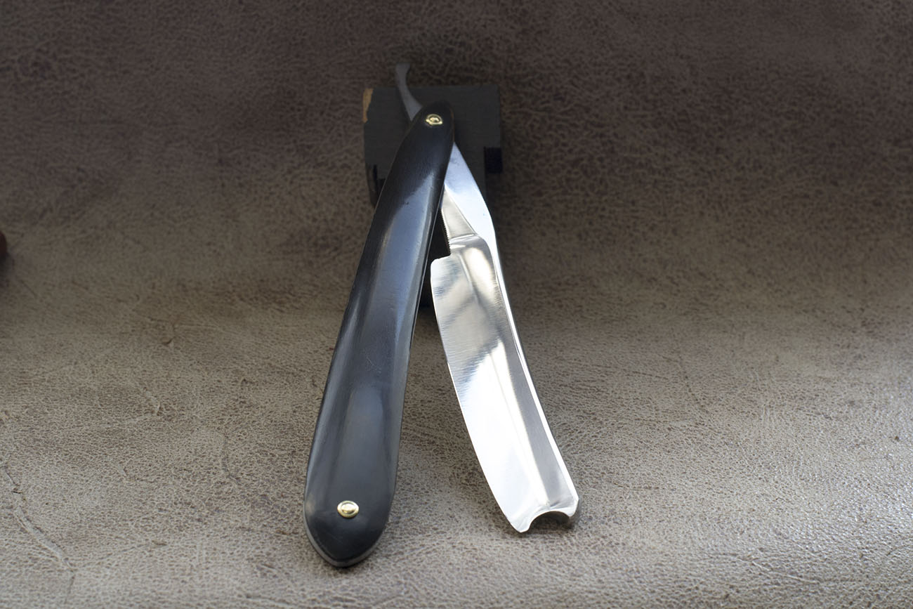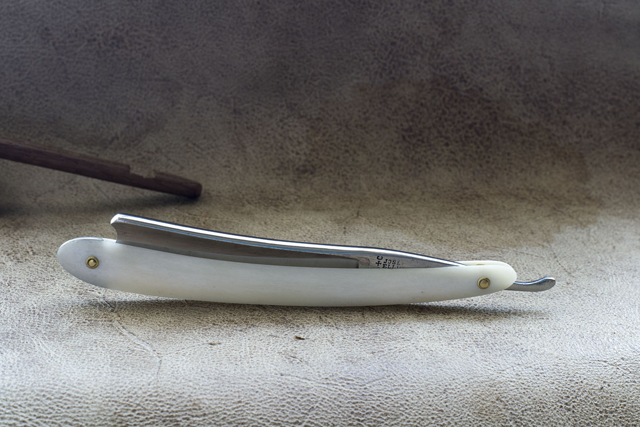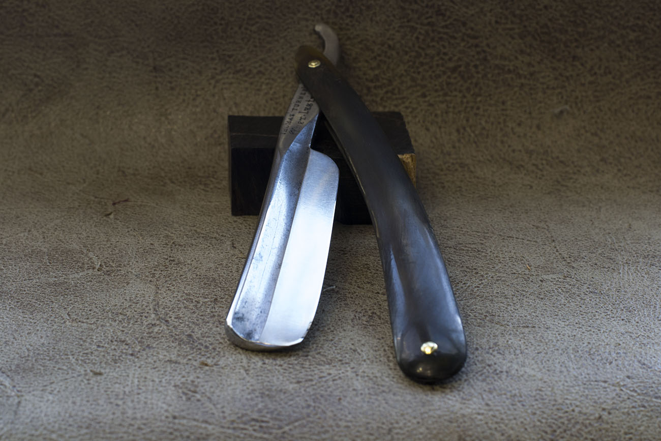 Миниатюрный, узкий полуклин от одного из известнейших производителей в Англии – Joseph Rodgers & Sons. Надпись на эрле свидетельствует о том, что Джозеф Роджерс являлся поставщиком Их Величеств Королей и Королев Англии. Хоть это и является лишь косвенным доказательством качества продукции данного производителя, но на деле все именно так – бритвы от Роджерса – прекрасны, сделаны из качественной углеродки, с завода имеют отличную геометрию, бреют чисто и мягко. Данная бритва получила новую рукоять из кости буйвола, имеет ширину в 5/8, вогнутость 1/2 , геометрия близка к заводской, фаска в районе режущей кромки тонкая и равномерная. Бритва прекрасно подойдет для окантовки усов, висков и бороды, а так же для бритья 1-3 дневной щетины. Заточена и готова к бритью. Продано Joseph Show
