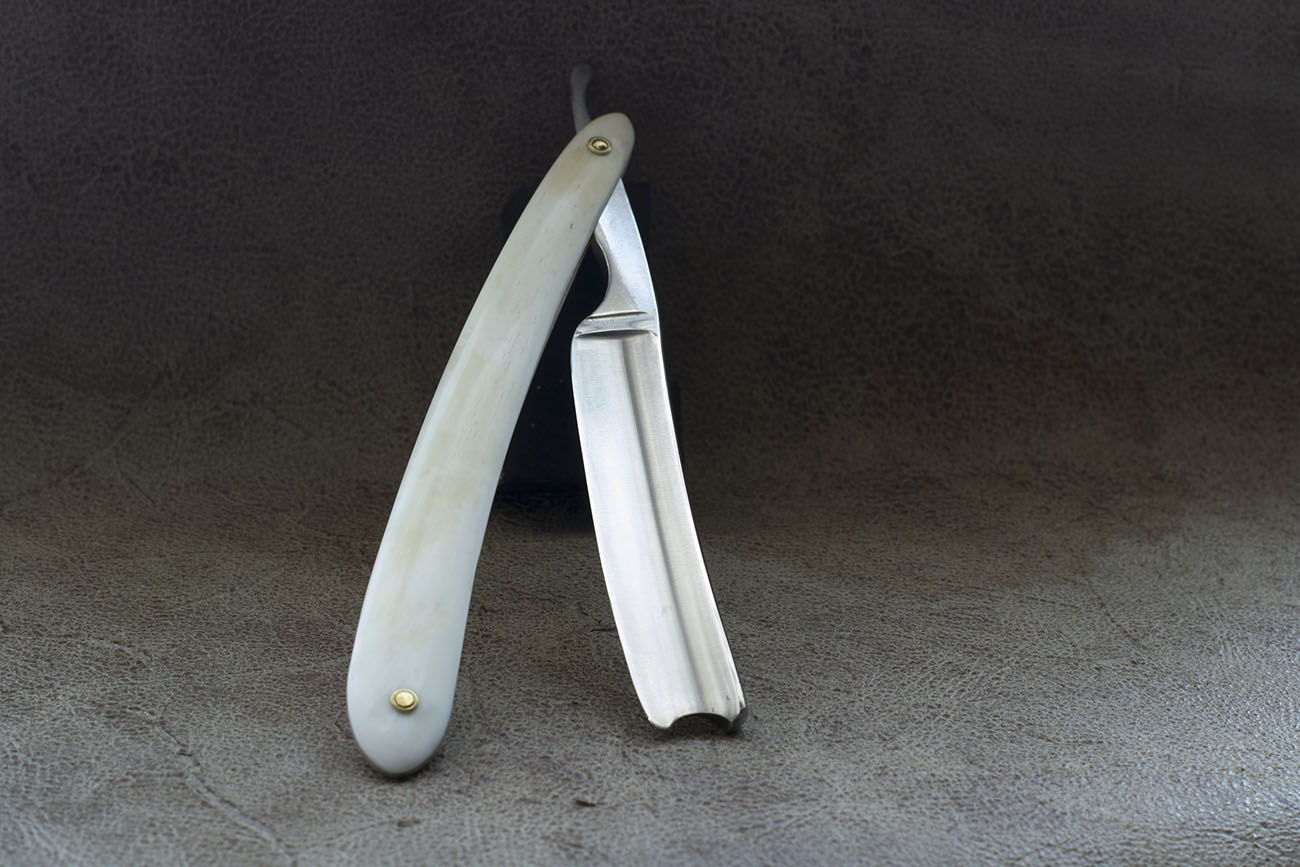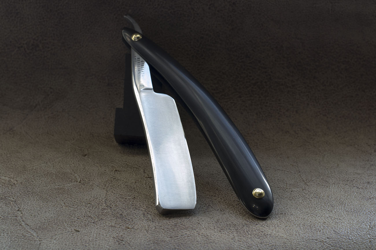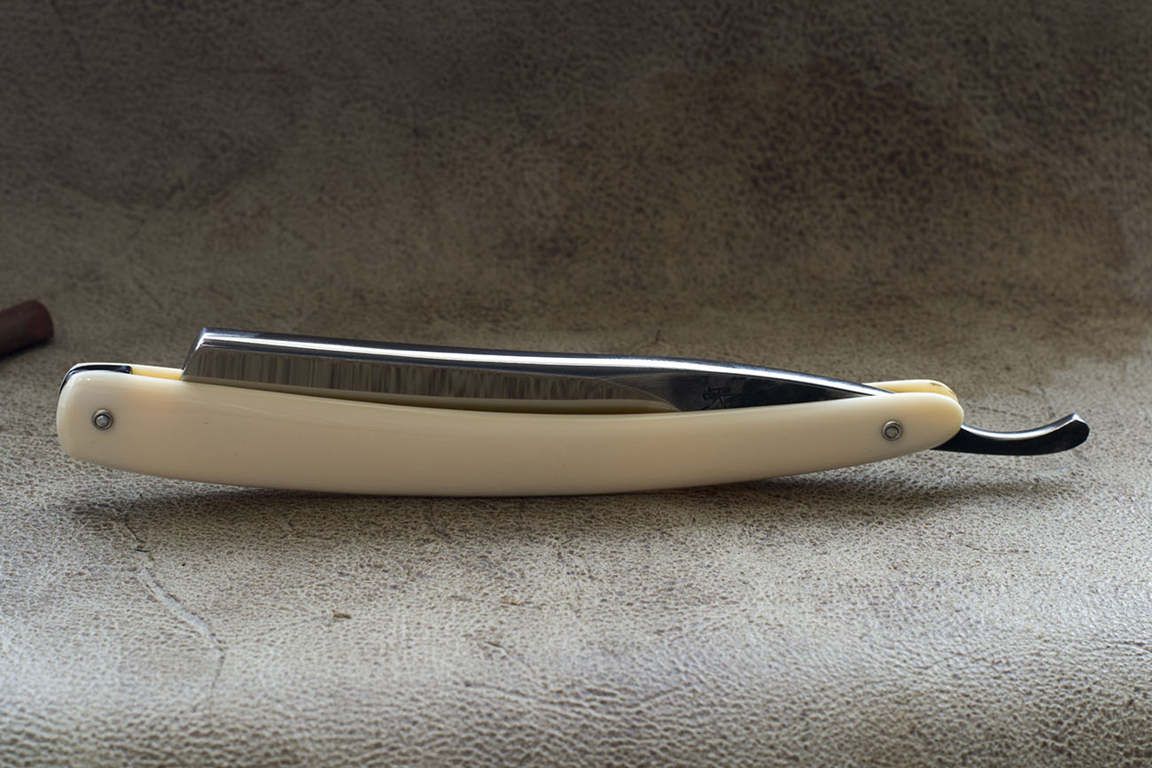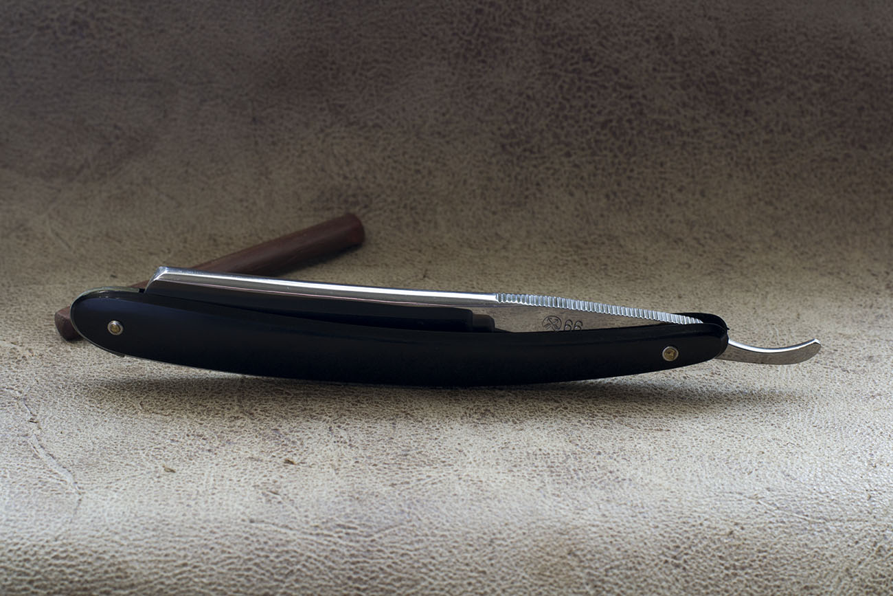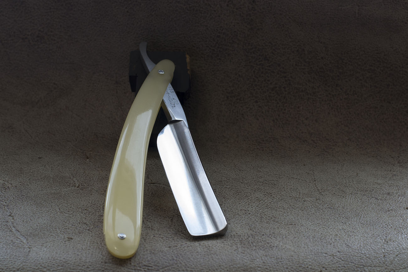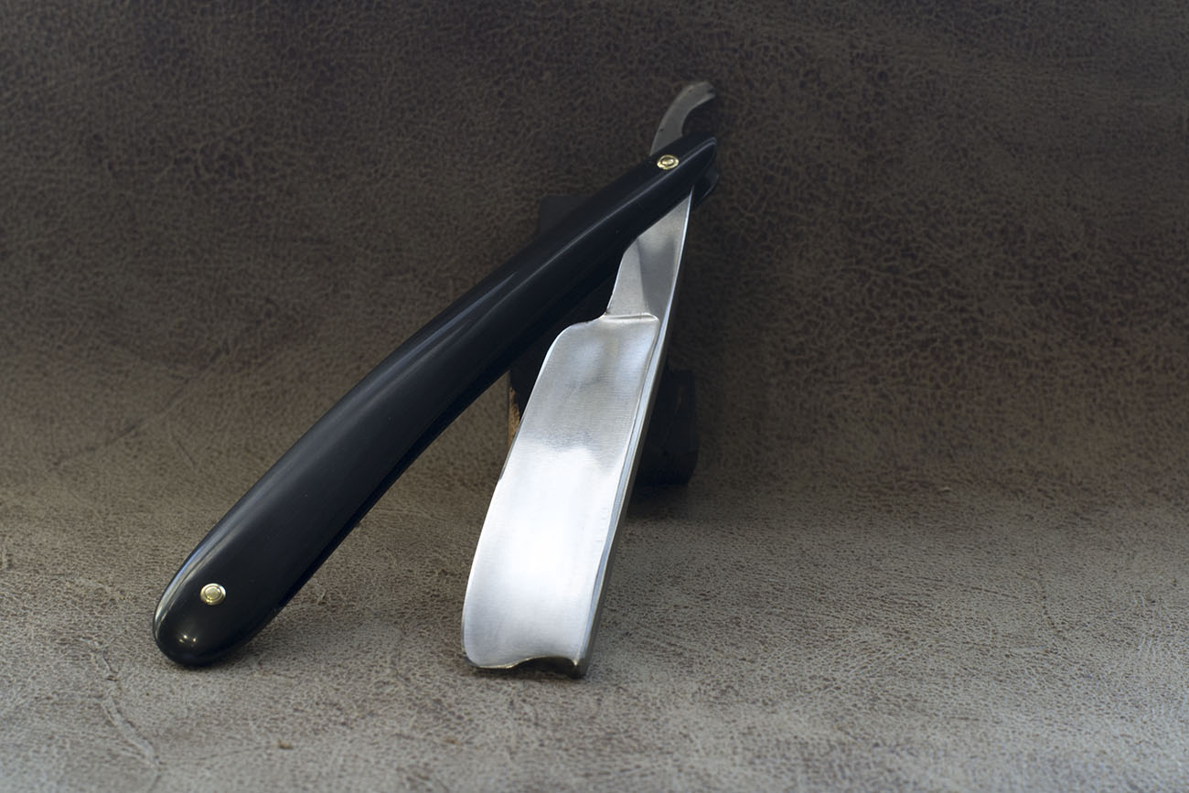 Миниатюрный, узкий полуклин от одного из известнейших производителей в Англии – Joseph Rodgers & Sons. Надпись на эрле свидетельствует о том, что Джозеф Роджерс являлся поставщиком Их Величеств Королей и Королев Англии. Хоть это и является лишь косвенным доказательством качества продукции данного производителя, но на деле все именно так – бритвы от Роджерса – прекрасны, сделаны из качественной углеродки, с завода имеют отличную геометрию, бреют чисто и мягко. Данная бритва получила новую рукоять из кости буйвола, имеет ширину в 5/8, вогнутость 1/2 , геометрия близка к заводской, фаска в районе режущей кромки тонкая и равномерная. Бритва прекрасно подойдет для окантовки усов, висков и бороды, а так же для бритья 1-3 дневной щетины. Заточена и готова к бритью. Продано Joseph Show