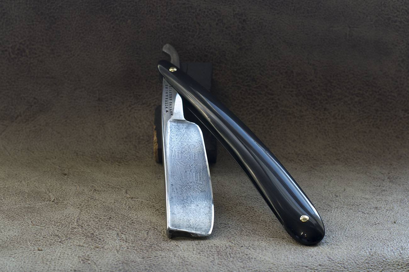 Ширина полотна 7/8 или 22 мм. Спинка 5.6 мм. Масонское травление довольно хорошо сохранилось. Очень интересная форма полотна – массивный и удобный эрль. Удалось сохранить правильную геометрию бритвы, не нанеся вред травлению. Сталь по качеству ничем не уступает стали более именитых и известных шеффилдских производителей. Так же стоит отметить парикмахерский вырез сделанный наискось и хвостовик сохранивший следы ковки в виде окалины на поверхности металла, придающие бритве особую аутентичность и уникальность. К сожалению, информация о производителе не доступна в открытых источниках в сети, кроме того я не нашел ни одной другой бритвы этого производителя, что говорит о малом тираже бритв W. Pitts. Судя по форме полотна и мотиву травления – бритва довольно древняя. 30-40 гг 19 века. Отличный подарок для коллекционеров. Продано Spoiler Show