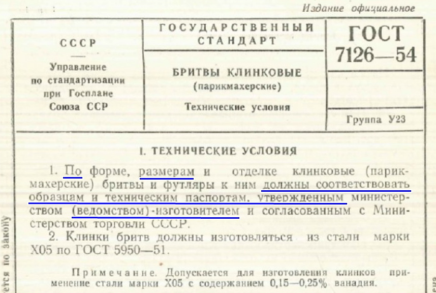 Вот: „По форме, размерам и отделке клинковые (парикмахерские) бритвы и футляры к ним должны соответствовать образцам и техническим паспортам, утвержденным министерством (ведомством)-изготовителем и согласованным с Министерством торговли СССР”.