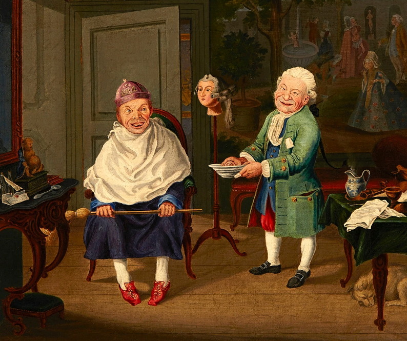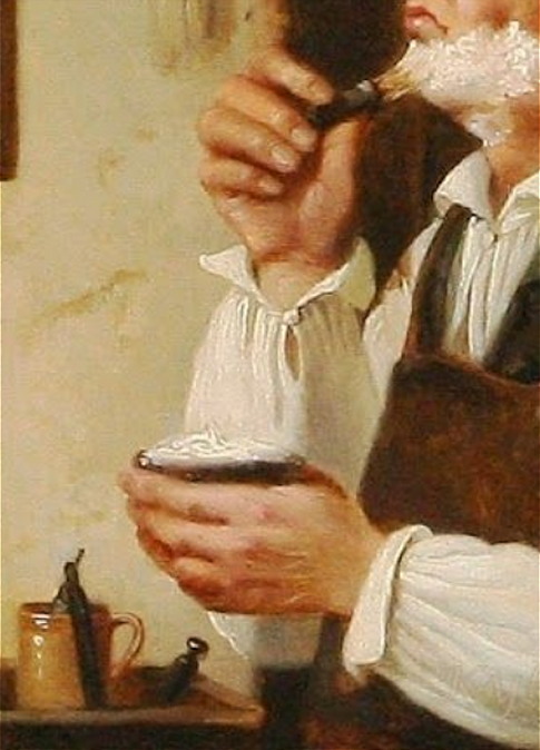 (Пульчинелла - персонаж итальянской комедии дель арте. Персонаж Пульчинеллы - это придурковатый развеселый крестьянин, бедняк и взбалмошный балагур, принимающийся за любую работу). „Pulchinello in a barber shop” „Пульчинелло в парикмахерской” 18 век. Взглянем поближе: С 2013 г. с кайфом бреюсь опасной бритвой пять раз в неделю, в три прохода.