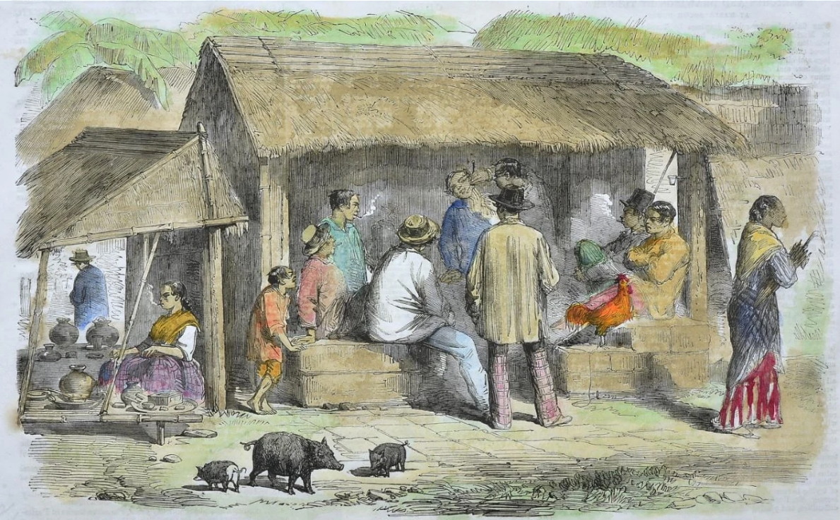 Barber's Shop in Manilla, 1857 - 1858 (Без автора, в нецветном виде и в плохом качестве я уже ее показывал, а теперь - одно заглядение). Взглянем поближе: С 2013 г. с кайфом бреюсь опасной бритвой пять раз в неделю, в три прохода.