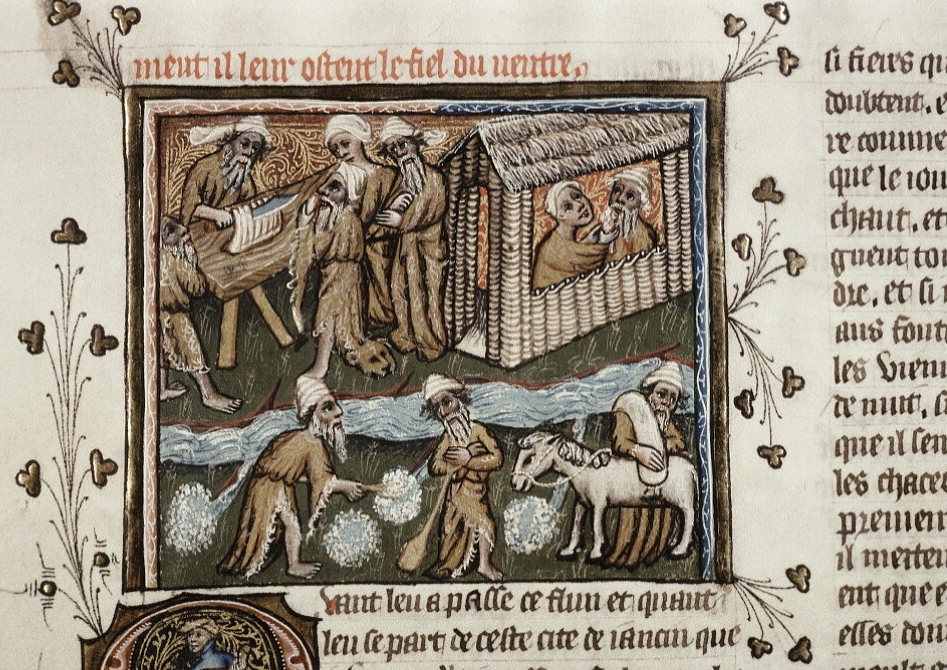 Marco Polo „Li Livres du Graunt Caam”. (анг. Marco Polo „The Book of the Grand Khan”, french version of „Il Milione”). Марко Поло „Книга Великого хана”, французская версия книги „Il Milione”). Часть III, рис. 248, художник Johannes (Йоханнес, фламандская школа), ок. 1400 г. На старофранцузском (фр. ancien français) написано, что на рисунке изображены: - окопы для ловли змей (крокодилов, из которых продавали желчь в лечебных целях) из реки, наверху мясная лавка и цирюльня в Караяне/Карузан в Юньнани: Цирюльник: